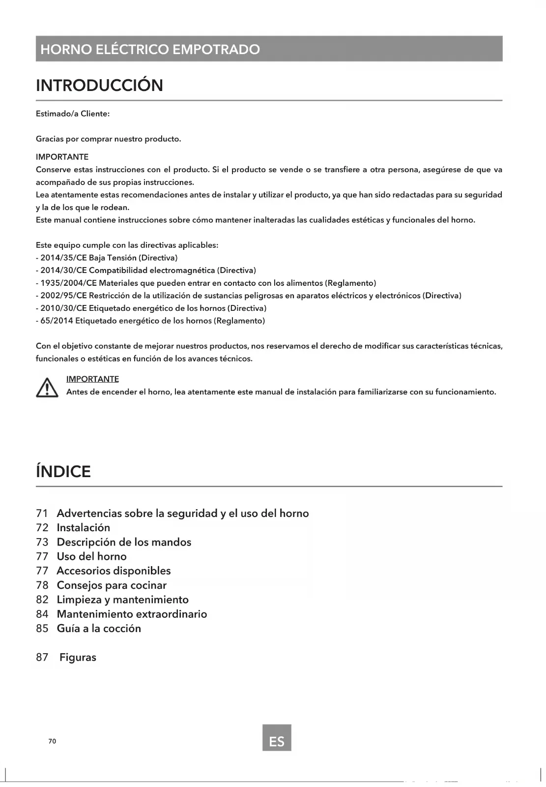 ÍNDICE 71 Advertencias sobre la seguridad y el uso del horno 72 Instalación 73 Descripción de los mandos 77 Uso del horno 77 Accesorios disponibles 78 Consejos para cocinar 82 Limpieza y mantenimiento 84 Mantenimiento extraordinario 85 Guía a la cocción 87 Figuras INTRODUCCIÓN Estimado/a Cliente: Gracias por comprar nuestro producto. IMPORTANTE Conserve estas instrucciones con el producto. Si el producto se vende o se transere a otra persona, asegúrese de que va acompañado de sus propias instrucciones. Lea atentamente estas recomendaciones antes de instalar y utilizar el producto, ya que han sido redactadas para su seguridad y la de los que le rodean. Este manual contiene instrucciones sobre cómo mantener inalteradas las cualidades estéticas y funcionales del horno. Este equipo cumple con las directivas aplicables: - 2014/35/CE Baja Tensión (Directiva) - 2014/30/CE Compatibilidad electromagnética (Directiva) - 1935/2004/CE Materiales que pueden entrar en contacto con los alimentos (Reglamento) - 2002/95/CE Restricción de la utilización de sustancias peligrosas en aparatos eléctricos y electrónicos (Directiva) - 2010/30/CE Etiquetado energético de los hornos (Directiva) - 65/2014 Etiquetado energético de los hornos (Reglamento) Con el objetivo constante de mejorar nuestros productos, nos reservamos el derecho de modicar sus características técnicas, funcionales o estéticas en función de los avances técnicos. IMPORTANTE Antes de encender el horno, lea atentamente este manual de instalación para familiarizarse con su funcionamiento.