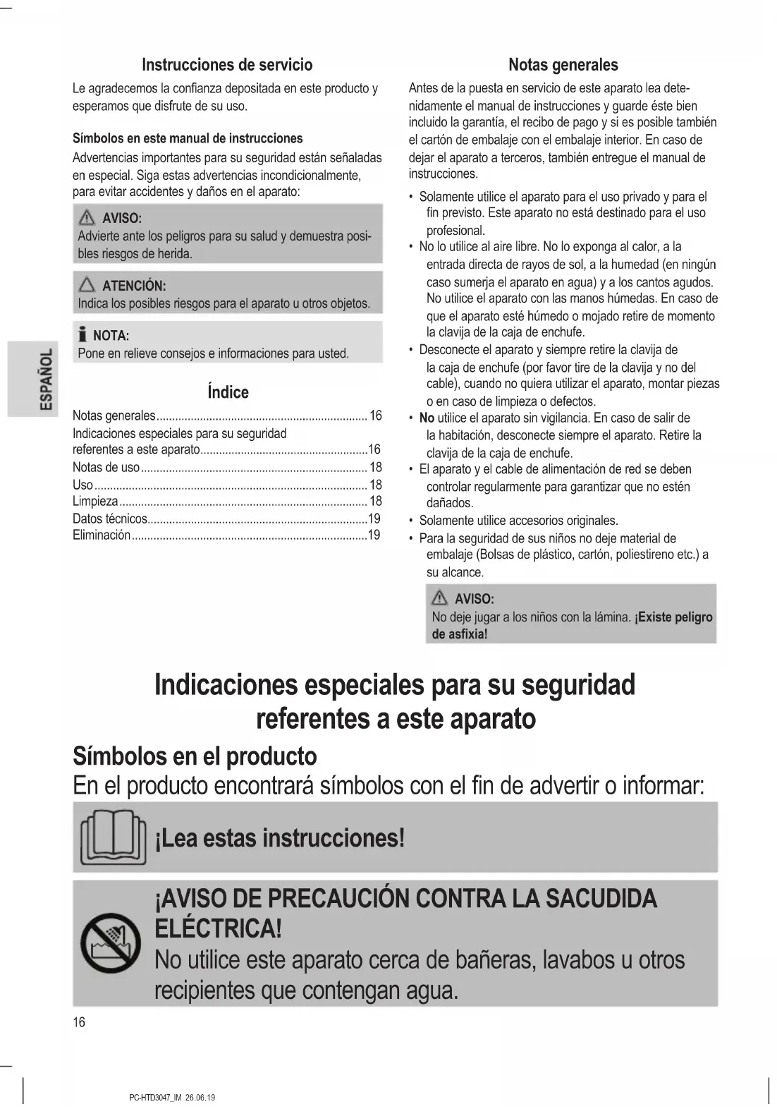 - Para la seguridad de sus niños no deje material de embalaje (Bolsas de plástico, cartón, poliestireno etc.) a su alcance. AVISO: No deje jugar a los niños con la lámina. ¡Existe peligro de asxia! Indicaciones especiales para su seguridad referentes a este aparato Símbolos en el producto En el producto encontrará símbolos con el n de advertir o informar: ¡Lea estas instrucciones! ¡AVISO DE PRECAUCIÓN CONTRA LA SACUDIDA ELÉCTRICA! No utilice este aparato cerca de bañeras, lavabos u otros recipientes que contengan agua.17 PC-HTD3047_IM 26.06.19 AVISO: