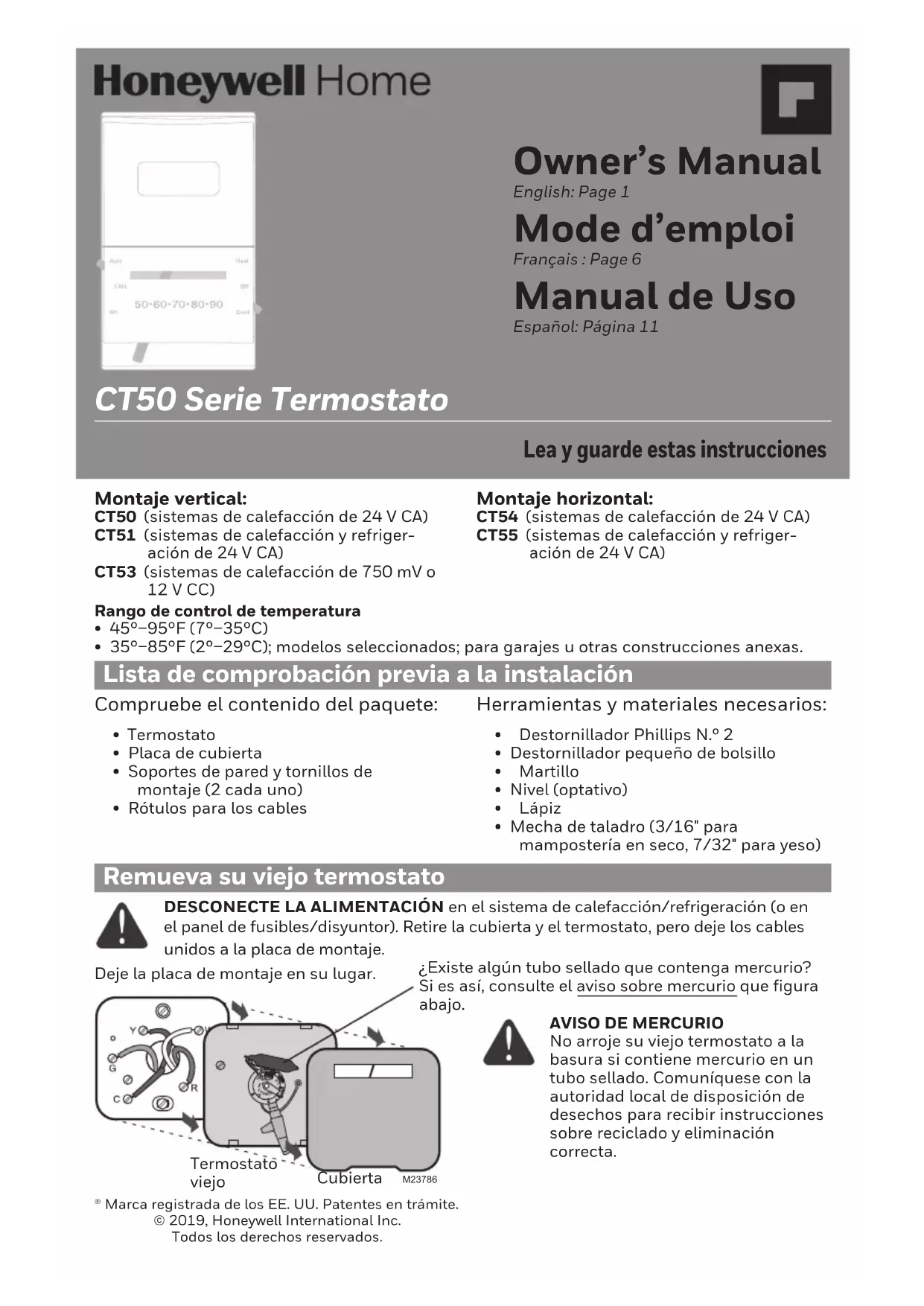 - Cool : Commande le système de refroidissement seulement (CT51/CT55). Fonctionnement M23797Read and save these instructions Compruebe el contenido del paquete:• Termostato• Placa de cubierta• Soportes de pared y tornillos de montaje (2 cada uno)• Rótulos para los cablesHerramientas y materiales necesarios:• Destornillador Phillips N.º 2• Destornillador pequeño de bolsillo• Martillo• Nivel (optativo)• Lápiz• Mecha de taladro (3/16" para mampostería en seco, 7/32" para yeso) Lista de comprobación previa a la instalación AVISO DE MERCURIONo arroje su viejo termostato a la basura si contiene mercurio en un tubo sellado. Comuníquese con la autoridad local de disposición de desechos para recibir instrucciones sobre reciclado y eliminación correcta. CT50 Serie Termostato Owner’s Manual English: Page 1 Mode d’emploi Français : Page 6 Manual de Uso Español: Página 11M23786 Termostato viejoDeje la placa de montaje en su lugar.¿Existe algún tubo sellado que contenga mercurio? Si es así, consulte el aviso sobre mercurio que figura abajo.Cubierta® Marca registrada de los EE. UU. Patentes en trámite. © 2019, Honeywell International Inc. Todos los derechos reservados.Montaje vertical:CT50 (sistemas de calefacción de 24 V CA)CT51 (sistemas de calefacción y refriger-ación de 24 V CA)CT53 (sistemas de calefacción de 750 mV o 12 V CC)Montaje horizontal:CT54 (sistemas de calefacción de 24 V CA)CT55 (sistemas de calefacción y refriger-ación de 24 V CA)DESCONECTE LA ALIMENTACIÓN en el sistema de calefacción/refrigeración (o en el panel de fusibles/disyuntor). Retire la cubierta y el termostato, pero deje los cables unidos a la placa de montaje. Remueva su viejo termostato Rango de control de temperatura • 45°–95°F (7°–35°C)• 35°–85°F (2°–29°C); modelos seleccionados; para garajes u otras construcciones anexas. Lea y guarde estas instruccionesCT50 Serie • Manual de Uso 69-2040EFS—04 12 Rotule los cables y retire la vieja placa de montaje Use un destornillador para desconectar los cables uno a uno. A medida que desconecte cada cable, péguele alrededor el rótulo con la misma letra que figura en su viejo termostato. (En el paquete de su termostato se incluyen rótulos autoadhesivos). Retire la vieja placa de montaje sólo después de haber rotulado todos los cables. Tenga cui- dado de no dejar que los cables sueltos caigan en el hueco de la pared. Envuelva firmemente los rótulos provistos alrededor de cada cable ¡No permita que los cables caigan en el hueco de la pared! IGNORE LOS COLORES DE LOS CABLES: Use sólo letras para identificar los tipos de cable. Para el modelo CT51/CT55: Si su viejo termóstato tiene 7 o más cables (no contando los terminales C o C1), usted pudo haber comprado el termóstato incorrecto del reemplazo. Interrumpa la instalación y llame al 18004681502 para pedir consejo. Marque la posición para el montaje Para el modelo CT50/CT53/CT54: Si su viejo termóstato tiene 3 o más cables (no contando los terminales C o C1), usted pudo haber comprado el termóstato incorrecto del reemplazo. Interrumpa la instalación y llame al 18004681502 para pedir consejo.