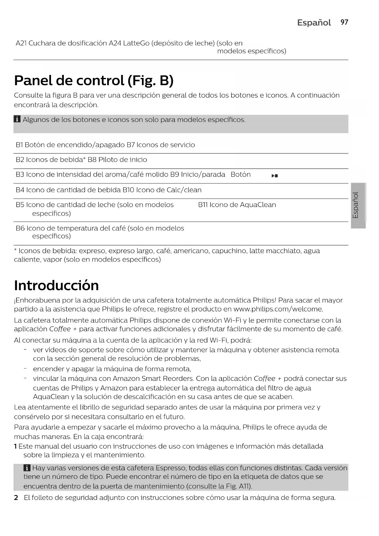 vincular la máquina con Amazon Smart Reorders. Con la aplicación Coffee + podrá conectar sus cuentas de Philips y Amazon para establecer la entrega automática del filtro de agua AquaClean y la solución de descalcificación en su casa antes de que se acaben. Lea atentamente el librillo de seguridad separado antes de usar la máquina por primera vez y consérvelo por si necesitara consultarlo en el futuro. Para ayudarle a empezar y sacarle el máximo provecho a la máquina, Philips le ofrece ayuda de muchas maneras. En la caja encontrará: 1 Este manual del usuario con instrucciones de uso con imágenes e información más detallada sobre la limpieza y el mantenimiento. Hay varias versiones de esta cafetera Espresso, todas ellas con funciones distintas. Cada versión tiene un número de tipo. Puede encontrar el número de tipo en la etiqueta de datos que se encuentra dentro de la puerta de mantenimiento (consulte la Fig. A11). 2 El folleto de seguridad adjunto con instrucciones sobre cómo usar la máquina de forma segura.98 Español 3 Para obtener soporte en línea (vídeos, etc.), puede utilizar la aplicación Coffee + o bien escanear el código QR de la portada de este folleto, o también visitar www.philips.com/coffee-care Esta máquina se ha probado con café. Aunque se ha limpiado cuidadosamente, es posible que quede algún residuo de café. Le garantizamos, no obstante, que la máquina es absolutamente nueva. La máquina ajusta automáticamente la cantidad de café molido que se utiliza para hacer un café con el mejor sabor. Debe preparar 5 cafés para que la máquina complete su ajuste automático. Asegúrese de enjuagar el LatteGo (el depósito de leche) o el espumador de leche clásico antes de utilizarlo por primera vez. Antes de utilizarlo por primera vez