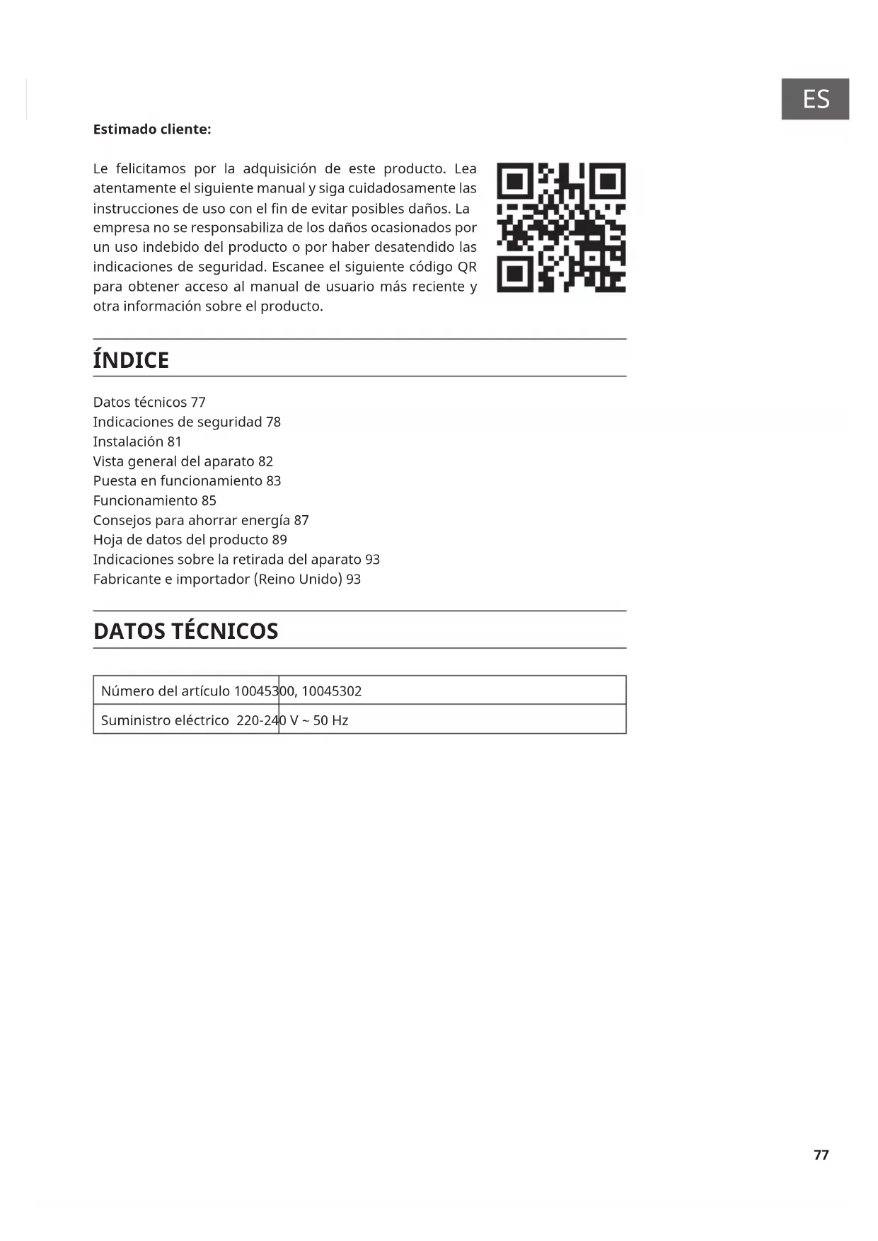 Número del artículo 10045300, 10045302 Suministro eléctrico 220-240 V ~ 50 Hz Datos técnicos 77 Indicaciones de seguridad 78 Instalación 81 Vista general del aparato 82 Puesta en funcionamiento 83 Funcionamiento 85 Consejos para ahorrar energía 87 Hoja de datos del producto 89 Indicaciones sobre la retirada del aparato 93 Fabricante e importador (Reino Unido) 9378
