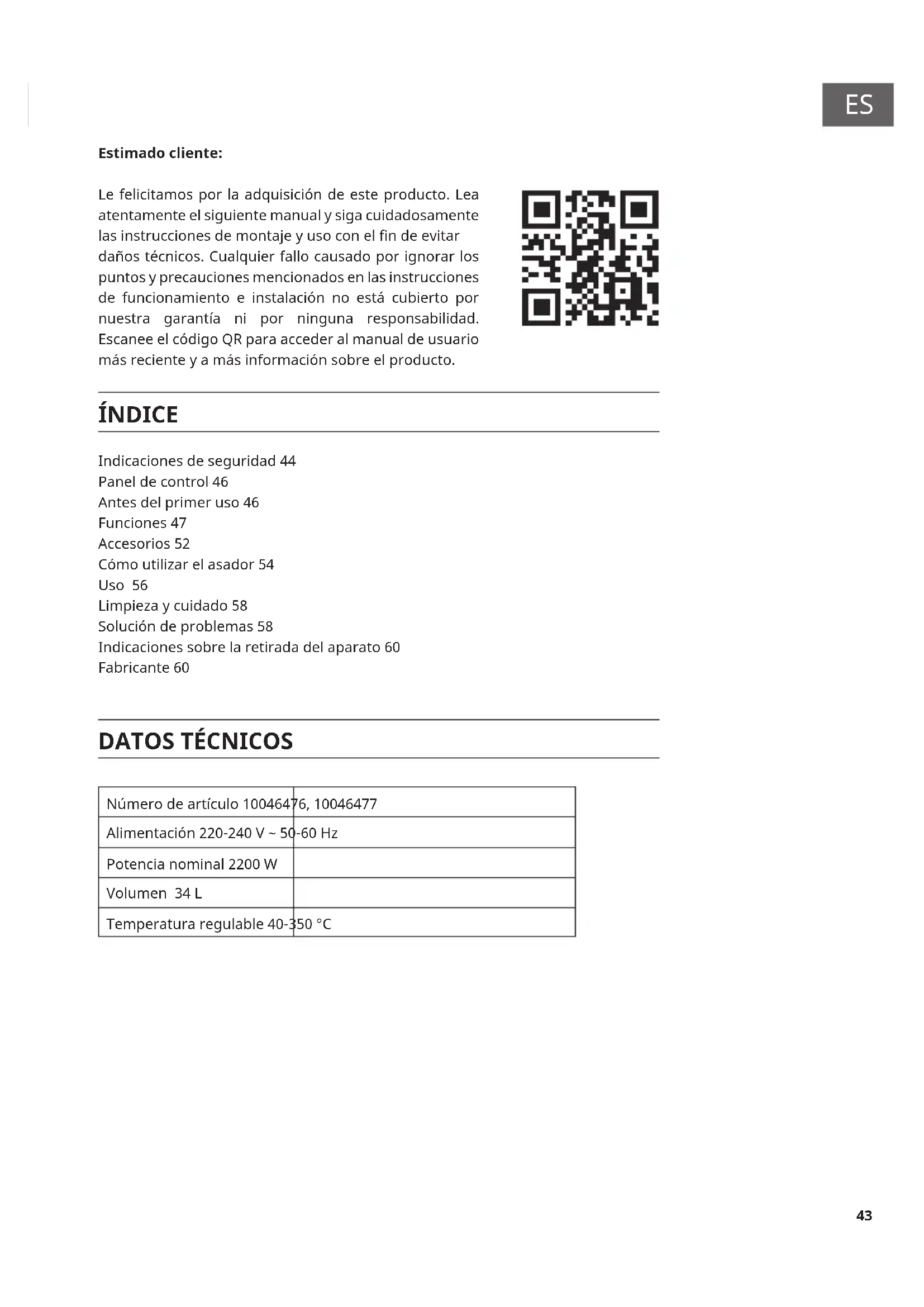 Número de artículo 10046476, 10046477 Alimentación 220-240 V ~ 50-60 Hz Potencia nominal 2200 W Volumen 34 L Temperatura regulable 40-350 °C ÍNDICE Indicaciones de seguridad 44 Panel de control 46 Antes del primer uso 46 Funciones 47 Accesorios 52 Cómo utilizar el asador 54 Uso 56 Limpieza y cuidado 58 Solución de problemas 58 Indicaciones sobre la retirada del aparato 60 Fabricante 60 Estimado cliente: Le felicitamos por la adquisición de este producto. Lea atentamente el siguiente manual y siga cuidadosamente las instrucciones de montaje y uso con el n de evitar daños técnicos. Cualquier fallo causado por ignorar los puntos y precauciones mencionados en las instrucciones de funcionamiento e instalación no está cubierto por nuestra garantía ni por ninguna responsabilidad. Escanee el código QR para acceder al manual de usuario más reciente y a más información sobre el producto.44
