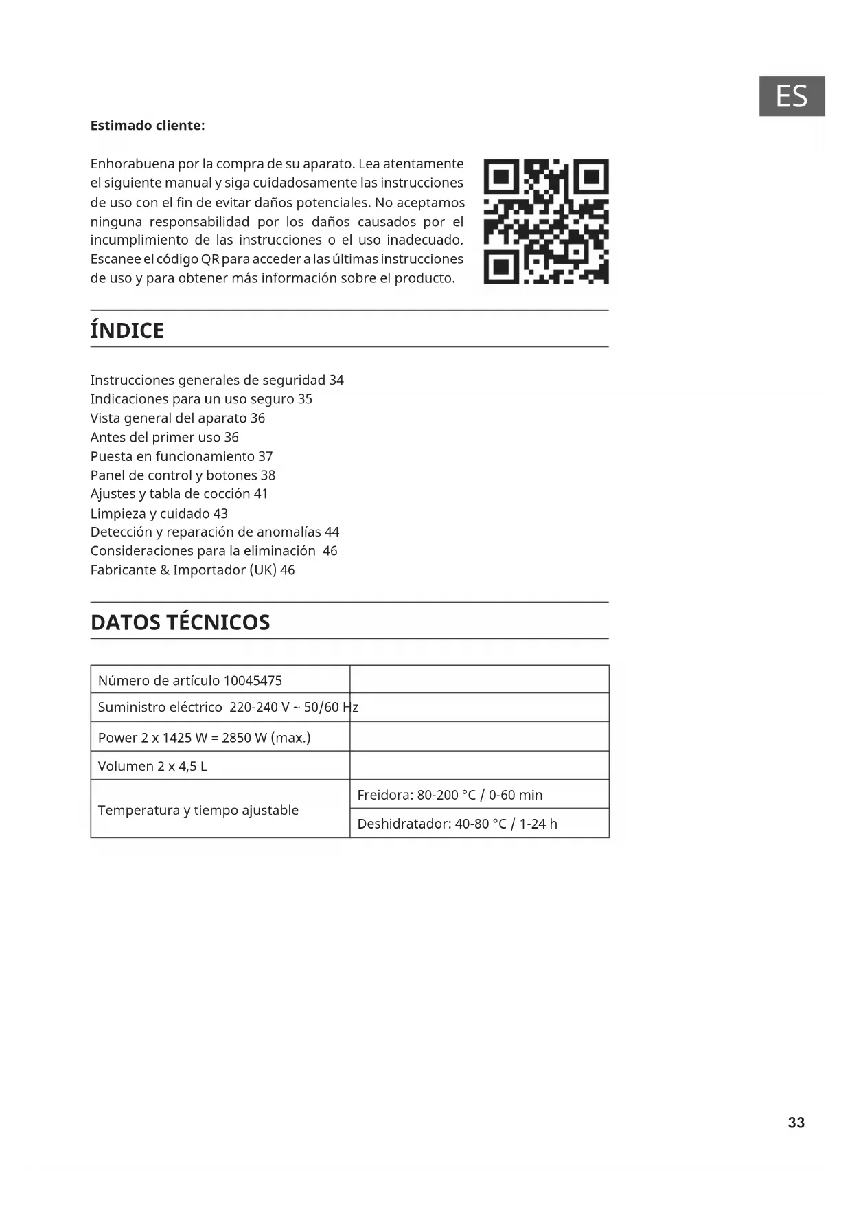 Estimado cliente: Enhorabuena por la compra de su aparato. Lea atentamente el siguiente manual y siga cuidadosamente las instrucciones de uso con el n de evitar daños potenciales. No aceptamos ninguna responsabilidad por los daños causados por el incumplimiento de las instrucciones o el uso inadecuado. Escanee el código QR para acceder a las últimas instrucciones de uso y para obtener más información sobre el producto. ÍNDICE Instrucciones generales de seguridad 34 Indicaciones para un uso seguro 35 Vista general del aparato 36 Antes del primer uso 36 Puesta en funcionamiento 37 Panel de control y botones 38 Ajustes y tabla de cocción 41 Limpieza y cuidado 43 Detección y reparación de anomalías 44 Consideraciones para la eliminación 46 Fabricante & Importador (UK) 46