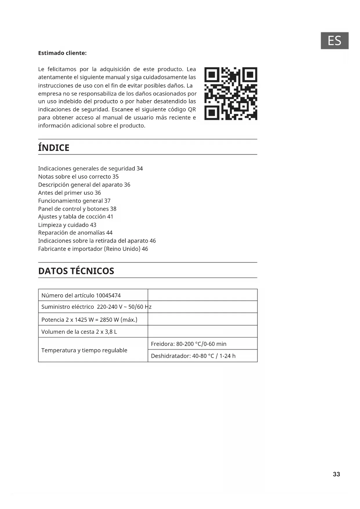 Estimado cliente: Le felicitamos por la adquisición de este producto. Lea atentamente el siguiente manual y siga cuidadosamente las instrucciones de uso con el n de evitar posibles daños. La empresa no se responsabiliza de los daños ocasionados por un uso indebido del producto o por haber desatendido las indicaciones de seguridad. Escanee el siguiente código QR para obtener acceso al manual de usuario más reciente e información adicional sobre el producto. ÍNDICE Indicaciones generales de seguridad 34 Notas sobre el uso correcto 35 Descripción general del aparato 36 Antes del primer uso 36 Funcionamiento general 37 Panel de control y botones 38 Ajustes y tabla de cocción 41 Limpieza y cuidado 43 Reparación de anomalías 44 Indicaciones sobre la retirada del aparato 46 Fabricante e importador (Reino Unido) 46
