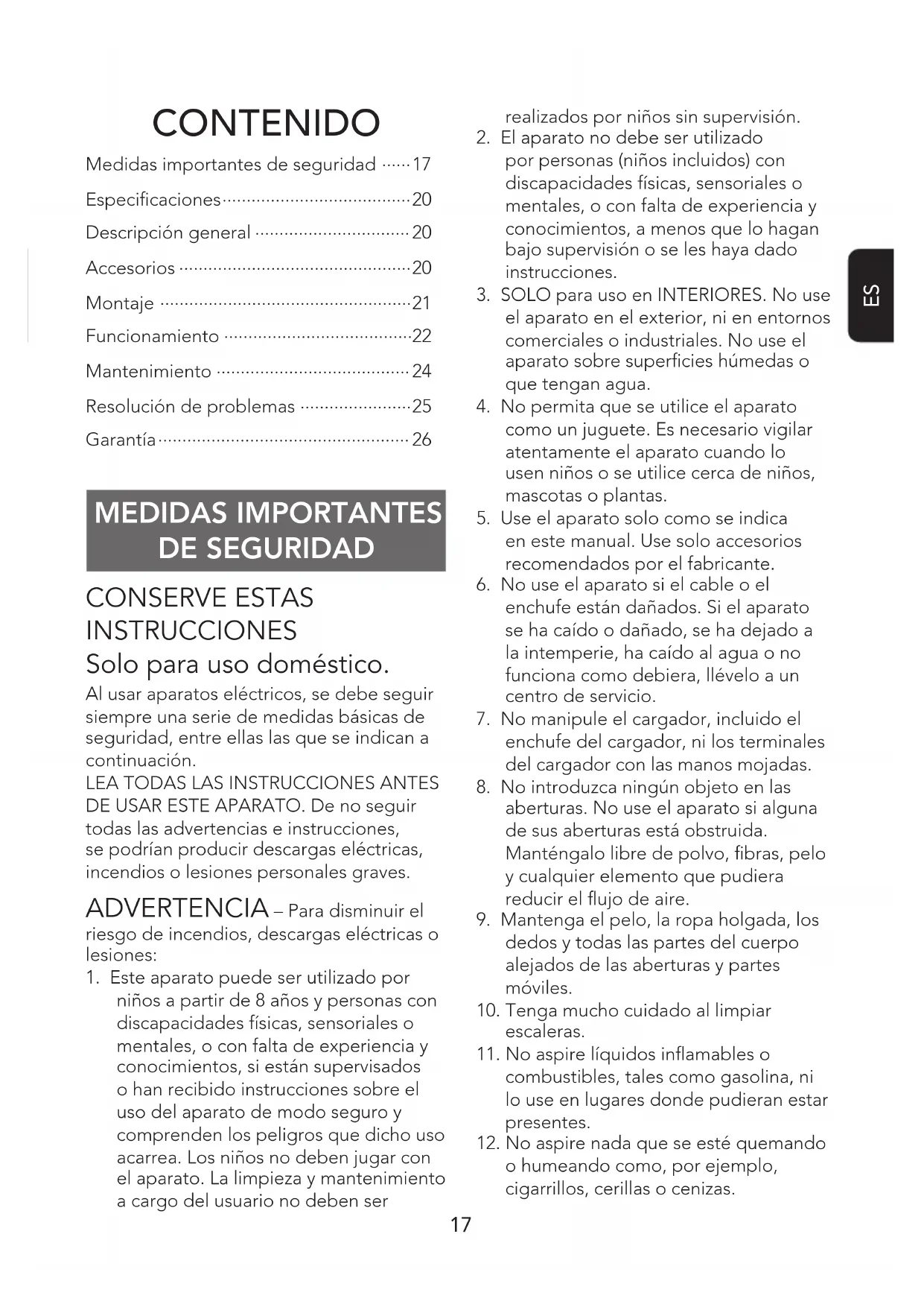 o humeando como, por ejemplo, cigarrillos, cerillas o cenizas. CONTENIDO Medidas importantes de seguridad