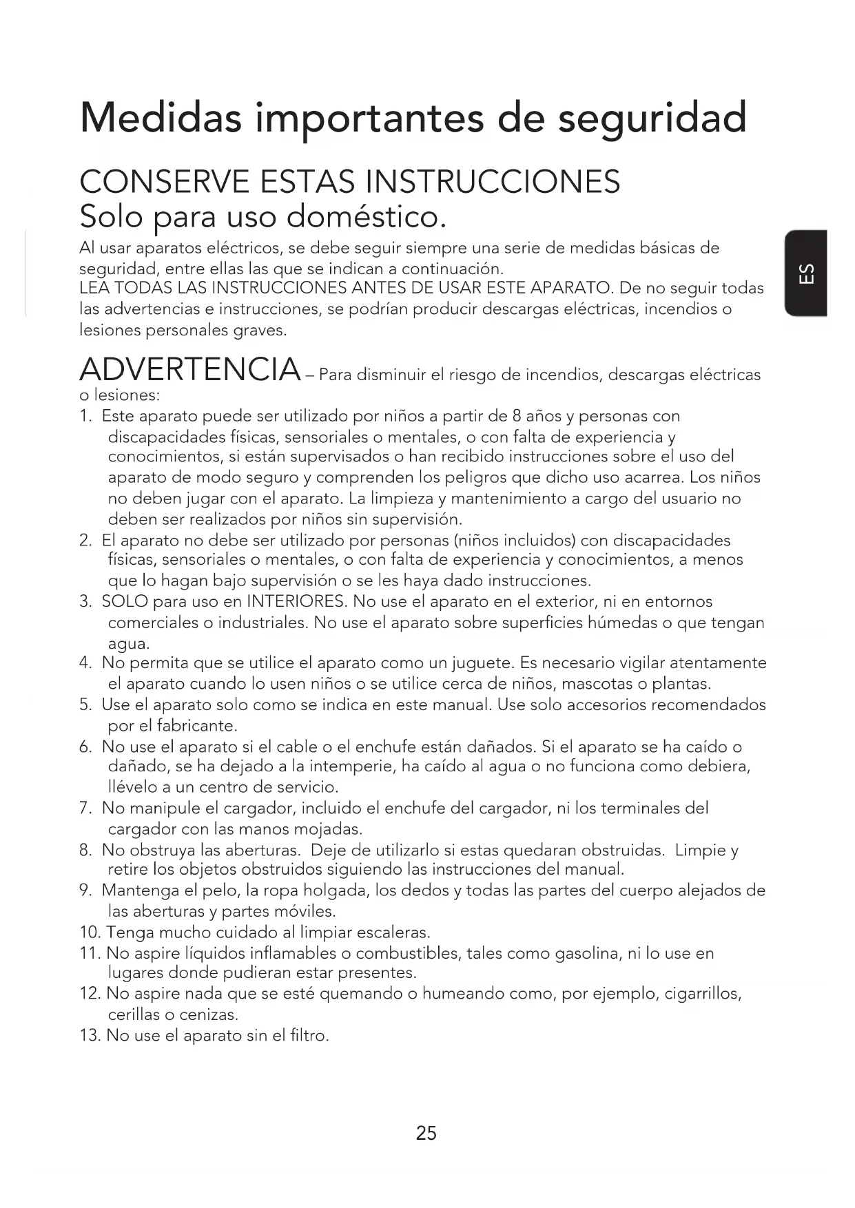 Solo para uso doméstico. Al usar aparatos eléctricos, se debe seguir siempre una serie de medidas básicas de seguridad, entre ellas las que se indican a continuación. LEA TODAS LAS INSTRUCCIONES ANTES DE USAR ESTE APARATO. De no seguir todas las advertencias e instrucciones, se podrían producir descargas eléctricas, incendios o lesiones personales graves. ADVERTENCIA – Para disminuir el riesgo de incendios, descargas eléctricas o lesiones:
