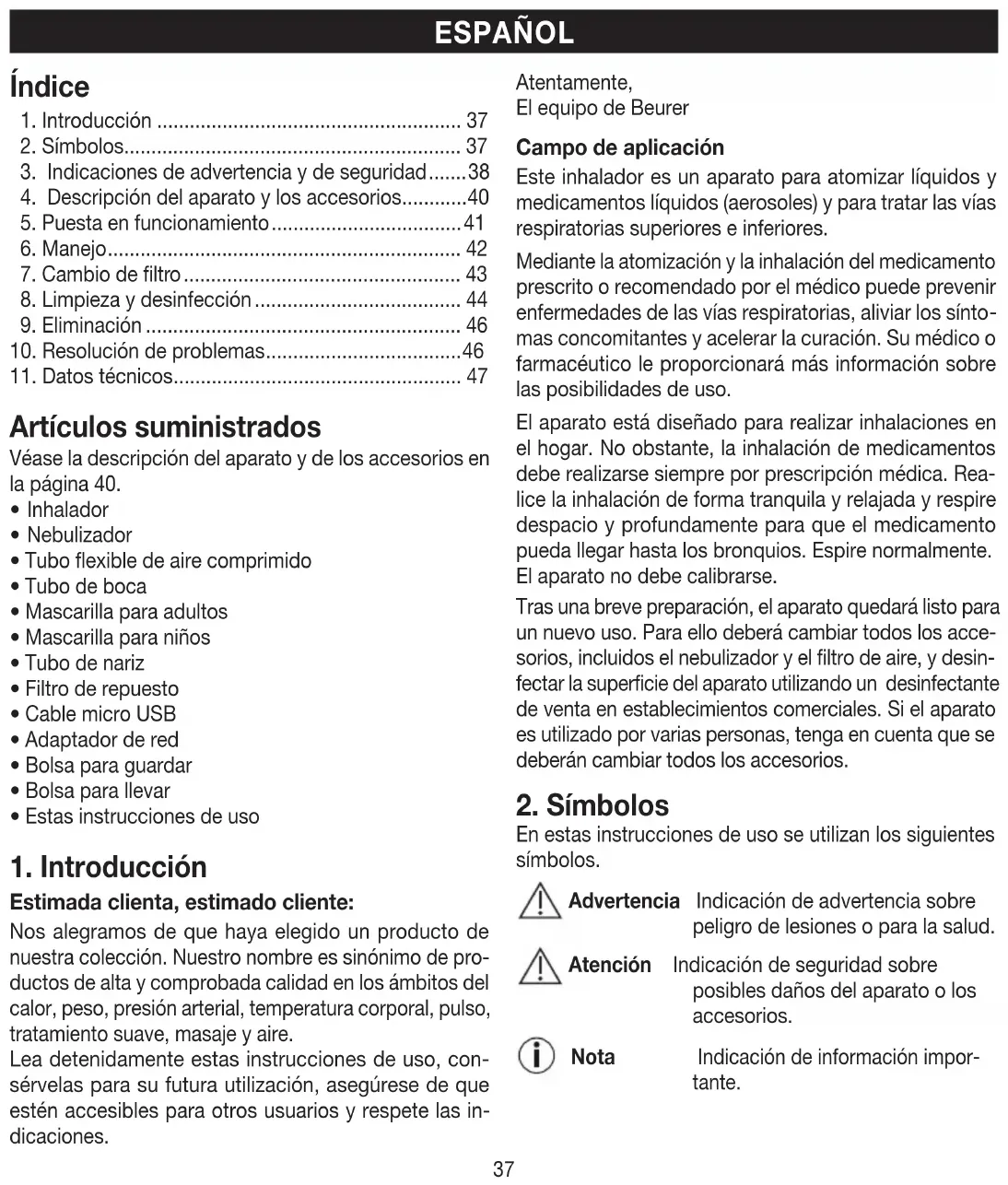 Estimada clienta, estimado cliente: Nos alegramos de que haya elegido un producto de nuestra colección. Nuestro nombre es sinónimo de pro- ductos de alta y comprobada calidad en los ámbitos del calor, peso, presión arterial, temperatura corporal, pulso, tratamiento suave, masaje y aire. Lea detenidamente estas instrucciones de uso, con- sérvelas para su futura utilización, asegúrese de que estén accesibles para otros usuarios y respete las in- dicaciones. Atentamente, El equipo de Beurer Campo de aplicación Este inhalador es un aparato para atomizar líquidos y medicamentos líquidos (aerosoles) y para tratar las vías respiratorias superiores e inferiores. Mediante la atomización y la inhalación del medicamento prescrito o recomendado por el médico puede prevenir enfermedades de las vías respiratorias, aliviar los sínto