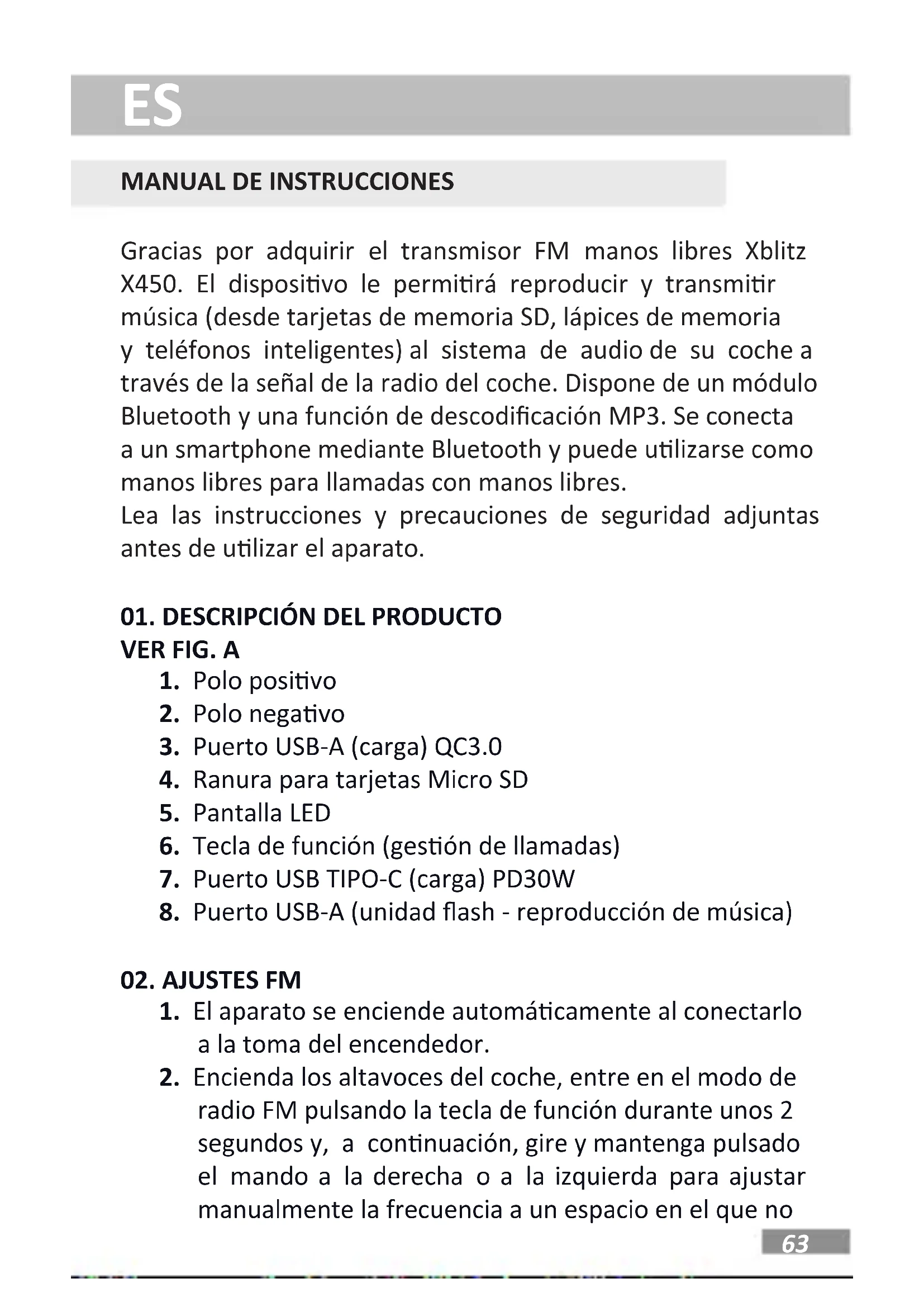 Gracias por adquirir el transmisor FM manos libres Xblitz X450. El disposivo le permirá reproducir y transmir música (desde tarjetas de memoria SD, lápices de memoria y teléfonos inteligentes) al sistema de audio de su coche a través de la señal de la radio del coche. Dispone de un módulo Bluetooth y una función de descodicación MP3. Se conecta a un smartphone mediante Bluetooth y puede ulizarse como manos libres para llamadas con manos libres. Lea las instrucciones y precauciones de seguridad adjuntas antes de ulizar el aparato.