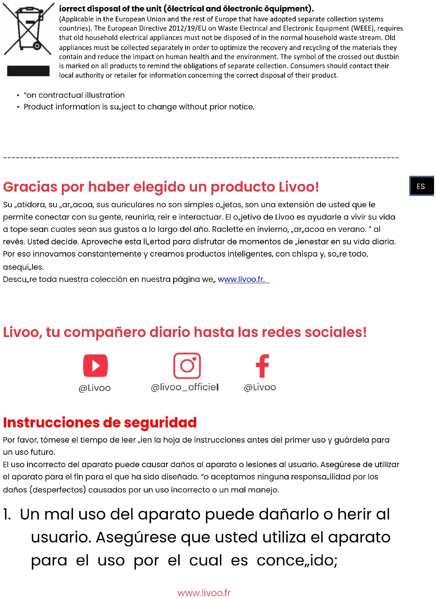 Gracias por haber elegido un producto Livoo! Su batidora, su barbacoa, sus auriculares no son simples objetos, son una extensión de usted que le permite conectar con su gente, reunirla, reír e interactuar. El objetivo de Livoo es ayudarle a vivir su vida a tope sean cuales sean sus gustos a lo largo del año. Raclette en invierno, barbacoa en verano. O al revés. Usted decide. Aproveche esta libertad para disfrutar de momentos de bienestar en su vida diaria. Por eso innovamos constantemente y creamos productos inteligentes, con chispa y, sobre todo, asequibles. Descubre toda nuestra colección en nuestra página web www.livoo.fr.