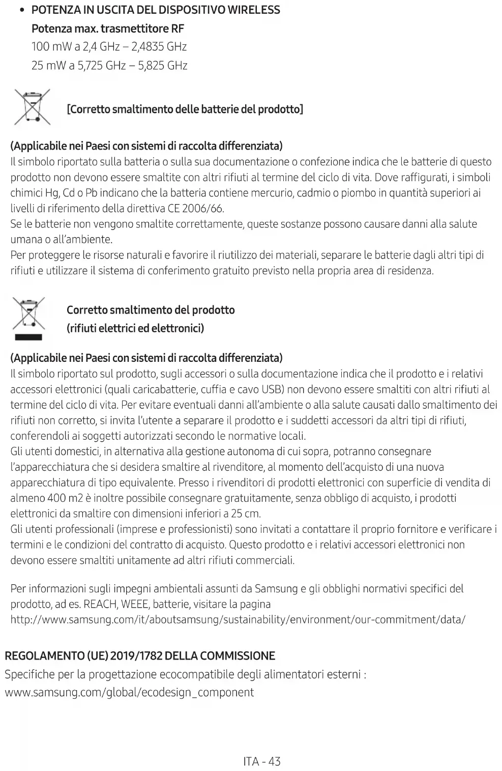 - POTENCIA DE SALIDA DEL DISPOSITIVO INALÁMBRICO Alimentación del transmisor máx. de RF 100 mW a 2,4 GHz – 2,4835 GHz 25 mW a 5,725 GHz – 5,825 GHz [Eliminacióncorrectadelasbateríasdeesteproducto] (Seaplicaenpaísesconsistemasderecolecciónporseparado) La presencia de esta marca en las baterías, el manual o el paquete del producto indica que cuando haya nalizado la vida útil de las baterías no deberán eliminarse junto con otros residuos domésticos. Los símbolos químicos Hg, Cd o Pb, si aparecen, indican que la batería contiene mercurio, cadmio o plomo en niveles superiores a los valores de referencia admitidos por la Directiva 2006/66 de la Unión Europea. Si las baterías no se desechan convenientemente, estas sustancias podrían provocar lesiones personales o dañar el medioambiente. Para proteger los recursos naturales y promover el reciclaje, separe las baterías de los demás residuos y recíclelas mediante el sistema de recogida gratuito de su localidad. Eliminación correcta de este producto (Residuos de aparatos eléctricos & electrónicos) (Seaplicaenpaísesconsistemasderecolecciónporseparado) La presencia de este símbolo en el producto, accesorios o material informativo que lo acompañan, indica que al nalizar su vida útil ni el producto ni sus accesorios electrónicos (como el cargador, cascos, cable USB) deberán eliminarse junto con otros residuos domésticos. Para evitar los posibles daños al medio ambiente o a la salud humana que representa la eliminación incontrolada de residuos, separe estos productos de otros tipos de residuos y recíclelos correctamente. De esta forma se promueve la reutilización sostenible de recursos materiales. Los usuarios particulares pueden contactar con el establecimiento donde adquirieron el producto o con las autoridades locales pertinentes para informarse sobre cómo y dónde pueden llevarlo para que sea sometido a un reciclaje ecológico y seguro. Los usuarios comerciales pueden contactar con su proveedor y consultar las condiciones del contrato de compra. Este producto y sus accesorios electrónicos no deben eliminarse junto a otros residuos comerciales. Para obtener información sobre los compromisos medioambientales de Samsung y las obligaciones reglamentarias de algún producto especíco como, por ejemplo, el reglamento REACH, RAEE o sobre las pilas, visite: www.samsung.com/uk/aboutsamsung/sustainability/environment/our-commitment/data/