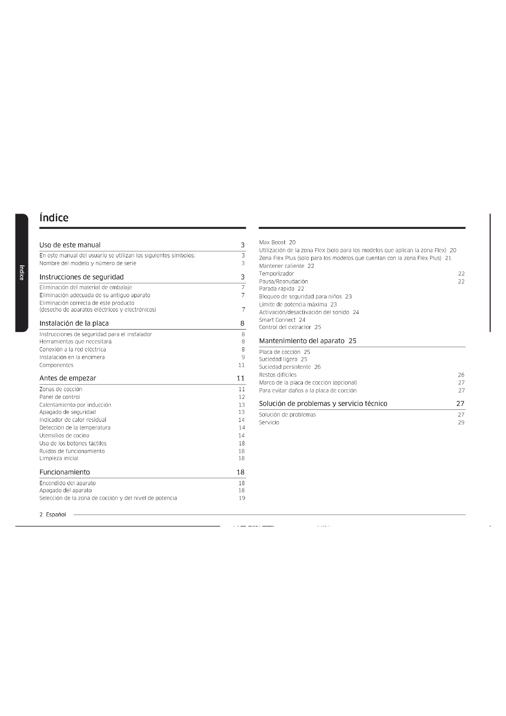 - (opłata według taryfy operatora) http://www.samsung.com/pl/support/ ROMANIA 0800872678 - Apel gratuit *8000 - Apel tarifat în reţea www.samsung.com/ro/support SERBIA 011 321 6899 www.samsung.com/rs/support SLOVAKIA 0800 - SAMSUNG (0800-726 786) www.samsung.com/sk/support LITHUANIA 8-800-77777 www.samsung.com/lt/support LATVIA 8000-7267 www.samsung.com/lv/support ESTONIA 800-7267 www.samsung.com/ee/support SLOVENIA 080 697 267 (brezplačna številka) www.samsung.com/si/support KOSOVO 038 40 30 90 www.samsung.com/support ΕΧΕΤΕ ΕΡΩΤΗΣΕΙΣ Ή ΣΧΟΛΙΑ;Placa de inducción Manual del usuario NZ64B6056** / NZ64B6058** NZ63B6056** / NZ63B6058**2 Español Índice Índice Max Boost 20 Utilización de la zona Flex (solo para los modelos que aplican la zona Flex) 20 Zona Flex Plus (solo para los modelos que cuentan con la zona Flex Plus) 21 Mantener caliente 22 Temporizador 22 Pausa/Reanudación 22 Parada rápida 22 Bloqueo de seguridad para niños 23 Límite de potencia máxima 23 Activación/desactivación del sonido 24 Smart Connect 24 Control del extractor 25 Mantenimiento del aparato 25 Placa de cocción 25 Suciedad ligera 25 Suciedad persistente 26 Restos difíciles 26 Marco de la placa de cocción (opcional) 27 Para evitar daños a la placa de cocción 27 Solución de problemas y servicio técnico 27 Solución de problemas 27 Servicio 29 Índice Uso de este manual 3 En este manual del usuario se utilizan los siguientes símbolos: 3 Nombre del modelo y número de serie 3 Instrucciones de seguridad 3 Eliminación del material de embalaje 7 Eliminación adecuada de su antiguo aparato 7 Eliminación correcta de este producto (desecho de aparatos eléctricos y electrónicos) 7 Instalación de la placa 8 Instrucciones de seguridad para el instalador 8 Herramientas que necesitará 8 Conexión a la red eléctrica 8 Instalación en la encimera 9 Componentes 11 Antes de empezar 11 Zonas de cocción 11 Panel de control 12 Calentamiento por inducción 13 Apagado de seguridad 13 Indicador de calor residual 14 Detección de la temperatura 14 Utensilios de cocina 14 Uso de los botones táctiles 18 Ruidos de funcionamiento 18 Limpieza inicial 18 Funcionamiento 18 Encendido del aparato 18 Apagado del aparato 18 Selección de la zona de cocción y del nivel de potencia 19Español 3 Uso de este manual Uso de este manual Tómese el tiempo necesario para leer este manual del usuario, prestando especial atención a la información de seguridad contenida en la siguiente sección, antes de utilizar el aparato. Conserve este manual para futuras consultas. Si se transere la propiedad del aparato, recuerde entregar el manual al nuevo propietario. En este manual del usuario se utilizan los siguientes símbolos: ADVERTENCIA Peligros o prácticas no seguras que pueden provocar lesiones personales graves o la muerte. PRECAUCIÓN Peligros o prácticas no seguras que pueden provocar lesiones personales leves o daños materiales. PRECAUCIÓN Para reducir el riesgo de incendio, explosión, descarga eléctrica o lesiones personales al utilizar su placa de cocción, siga estas precauciones básicas de seguridad. NOTA Consejos útiles, recomendaciones o información que ayuda a los usuarios a manipular el producto. Nombre del modelo y número de serie Tanto el nombre del modelo como el número de serie guran en una etiqueta debajo de la base de la placa de cocción. Para su uso posterior, anote la información o pegue la etiqueta adicional del producto (situada en la parte superior del mismo) en esta página. Nombre del modelo Número de serie Instrucciones de seguridad Los aspectos de seguridad de este aparato cumplen con todas las normas técnicas y de seguridad aceptadas. Sin embargo, como fabricantes también creemos que es nuestra responsabilidad que se familiarice con las siguientes instrucciones de seguridad. ADVERTENCIA Este aparato no está destinado a ser utilizado por personas (incluidos los niños) con capacidades físicas, sensoriales o mentales reducidas, o con falta de experiencia y conocimientos, a menos que hayan sido supervisados o instruidos en el uso del aparato por una persona responsable de su seguridad. Los niños deben ser supervisados para garantizar que no jueguen con el aparato. Este aparato puede ser utilizado por niños a partir de 8 años y por personas con capacidades físicas, sensoriales o mentales reducidas o con falta de experiencia y conocimientos, si han recibido supervisión o instrucciones sobre el uso del aparato de forma segura y comprenden los peligros que conlleva. Los niños no deben jugar con el aparato. La limpieza y el mantenimiento del usuario no deben ser realizados por niños sin supervisión. Los medios de desconexión deben estar incorporados en el cableado jo de acuerdo con las normas de cableado.4 Español Instrucciones de seguridad Instrucciones de seguridad El aparato no está destinado a ser operado por medio de un temporizador externo o un sistema de control remoto independiente. PRECAUCIÓN: El proceso de cocción debe ser supervisado. Los procesos de cocción de corta duración deben ser supervisados continuamente. El aparato no debe instalarse detrás de una puerta decorativa para evitar el sobrecalentamiento. ADVERTENCIA: El aparato y sus partes accesibles se calientan durante el uso. Hay que tener cuidado de no tocar los elementos calefactores. Los niños menores de 8 años deben mantenerse alejados a menos que estén bajo supervisión continua. ADVERTENCIA: Cocinar sin supervisión en una placa de cocción con grasa o aceite puede ser peligroso y provocar un incendio. NUNCA intente apagar un fuego con agua. En su lugar, apague el aparato y luego cubra la llama, por ejemplo, con una tapa o una manta ignífuga. ADVERTENCIA: Peligro de incendio: no coloque objetos sobre las supercies de cocción. ADVERTENCIA: Utilice únicamente las protecciones de la placa de cocción diseñadas o indicadas por el fabricante del aparato en las instrucciones de us