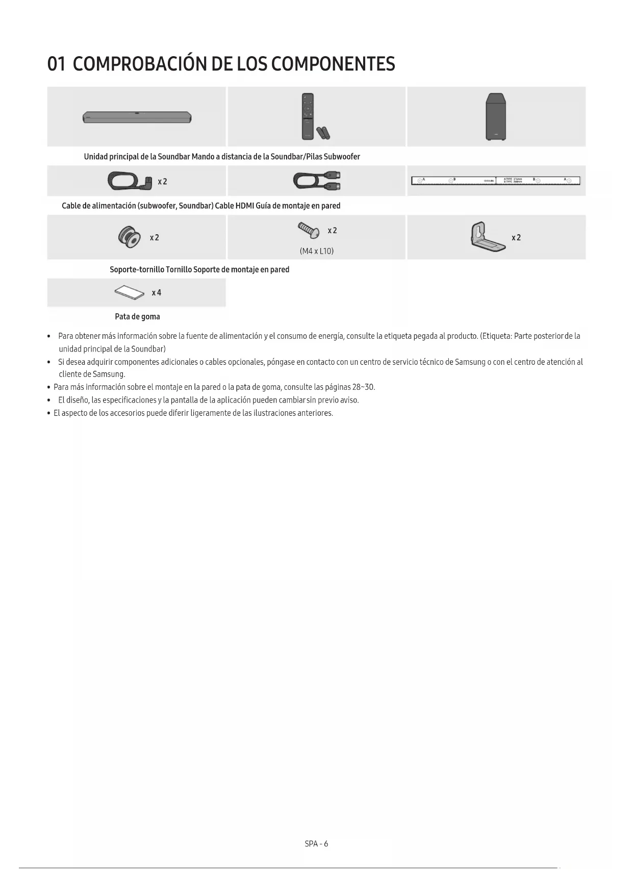VOL WOOFER SOUNDBAR SOUND MODE PAIR Unidad principal de la Soundbar Mando a distancia de la Soundbar/Pilas Subwoofer x 2 Cable de alimentación (subwoofer, Soundbar) Cable HDMI Guía de montaje en pared x 2 x 2 (M4 x L10) x 2 Soporte-tornillo Tornillo Soporte de montaje en pared x 4 Pata de goma