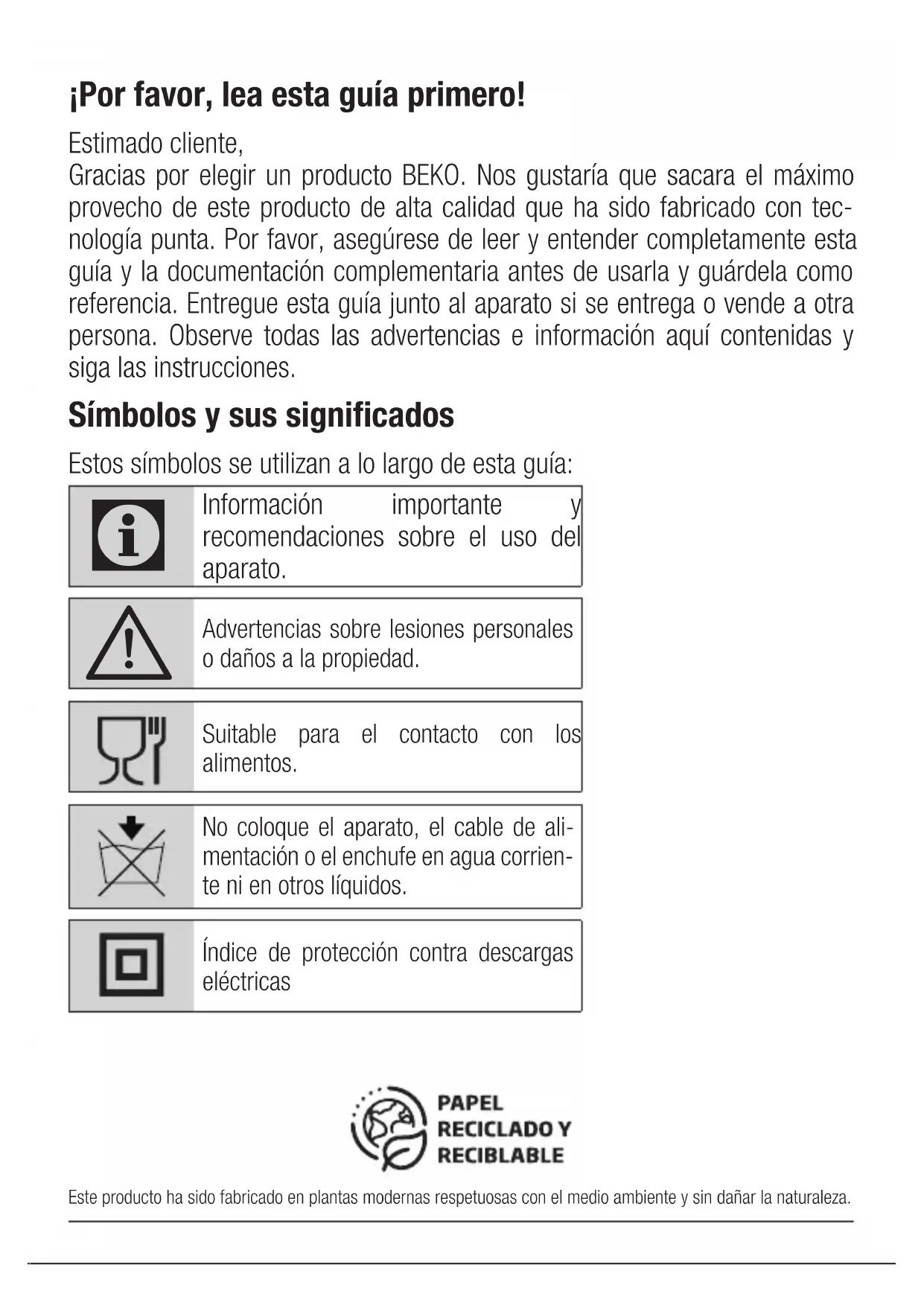 - Si l’appareil tombe, il peut ne plus fonctionner ou subir des dommages permanents.¡Por favor, lea esta guía primero! Estimado cliente, Gracias por elegir un producto BEKO. Nos gustaría que sacara el máximo provecho de este producto de alta calidad que ha sido fabricado con tec- nología punta. Por favor, asegúrese de leer y entender completamente esta guía y la documentación complementaria antes de usarla y guárdela como referencia. Entregue esta guía junto al aparato si se entrega o vende a otra persona. Observe todas las advertencias e información aquí contenidas y siga las instrucciones. Símbolos y sus significados Estos símbolos se utilizan a lo largo de esta guía: