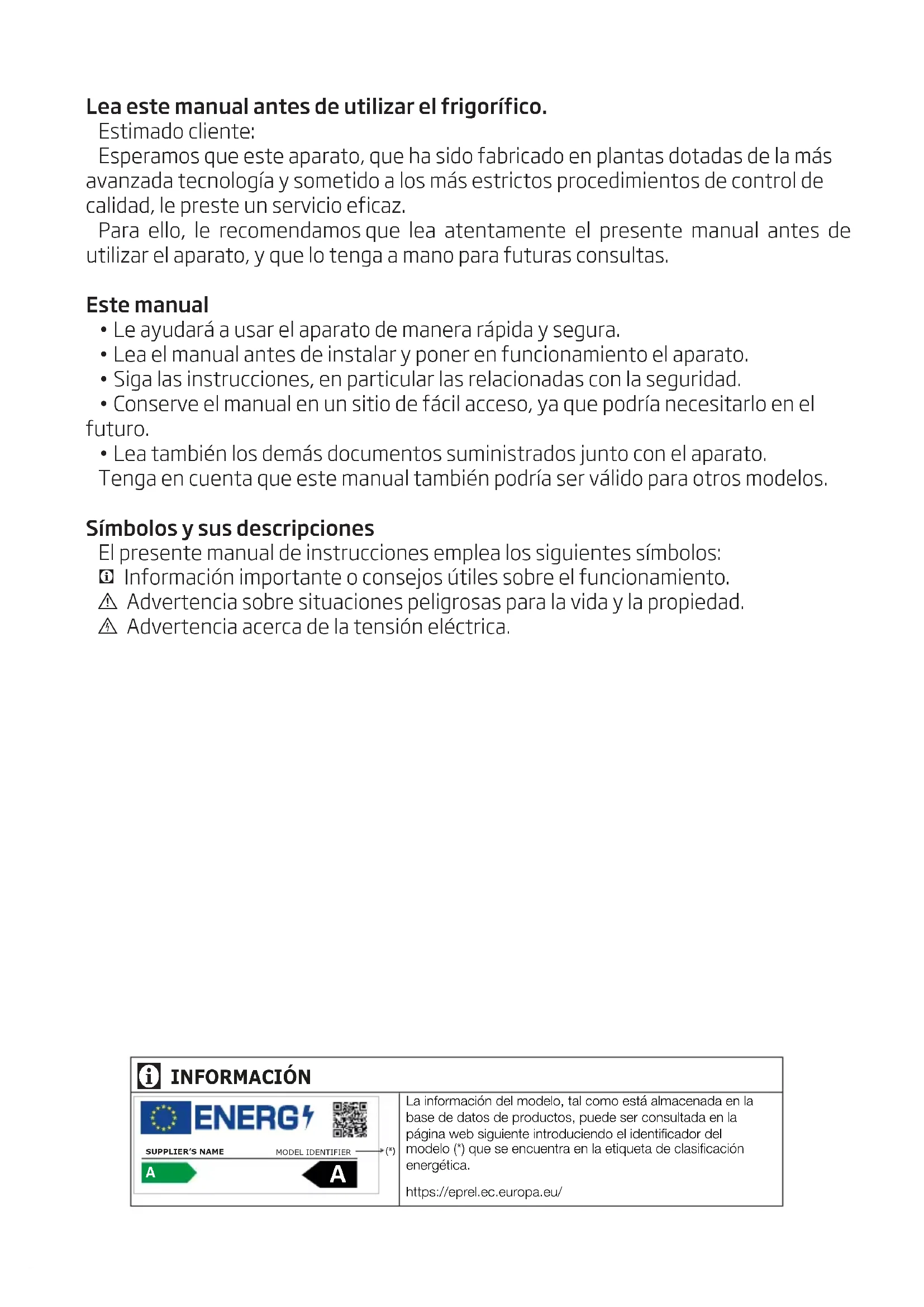 La información del modelo, tal como está almacenada en la base de datos de productos, puede ser consultada en la página web siguiente introduciendo el identificador del modelo (*) que se encuentra en la etiqueta de clasificación energética.https://eprel.ec.europa.eu/