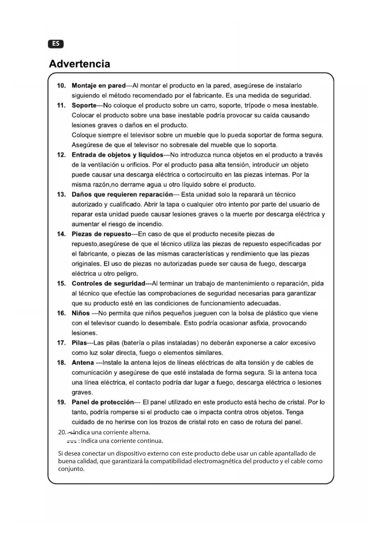 : Indica una corriente continua. Si desea conectar un dispositivo externo con este producto debe usar un cable apantallado de buena calidad, que garantizará la compatibilidad electromagnética del producto y el cable como conjunto. 212ES Riesgo de estabilidad No ponga nunca un aparato de televisión en una ubicación inestable; el aparato de televisión puede caer, causando lesiones personales graves o muerte. Muchas lesiones, especialmente en niños, pueden evitarse tomando precauciones sencillas como: