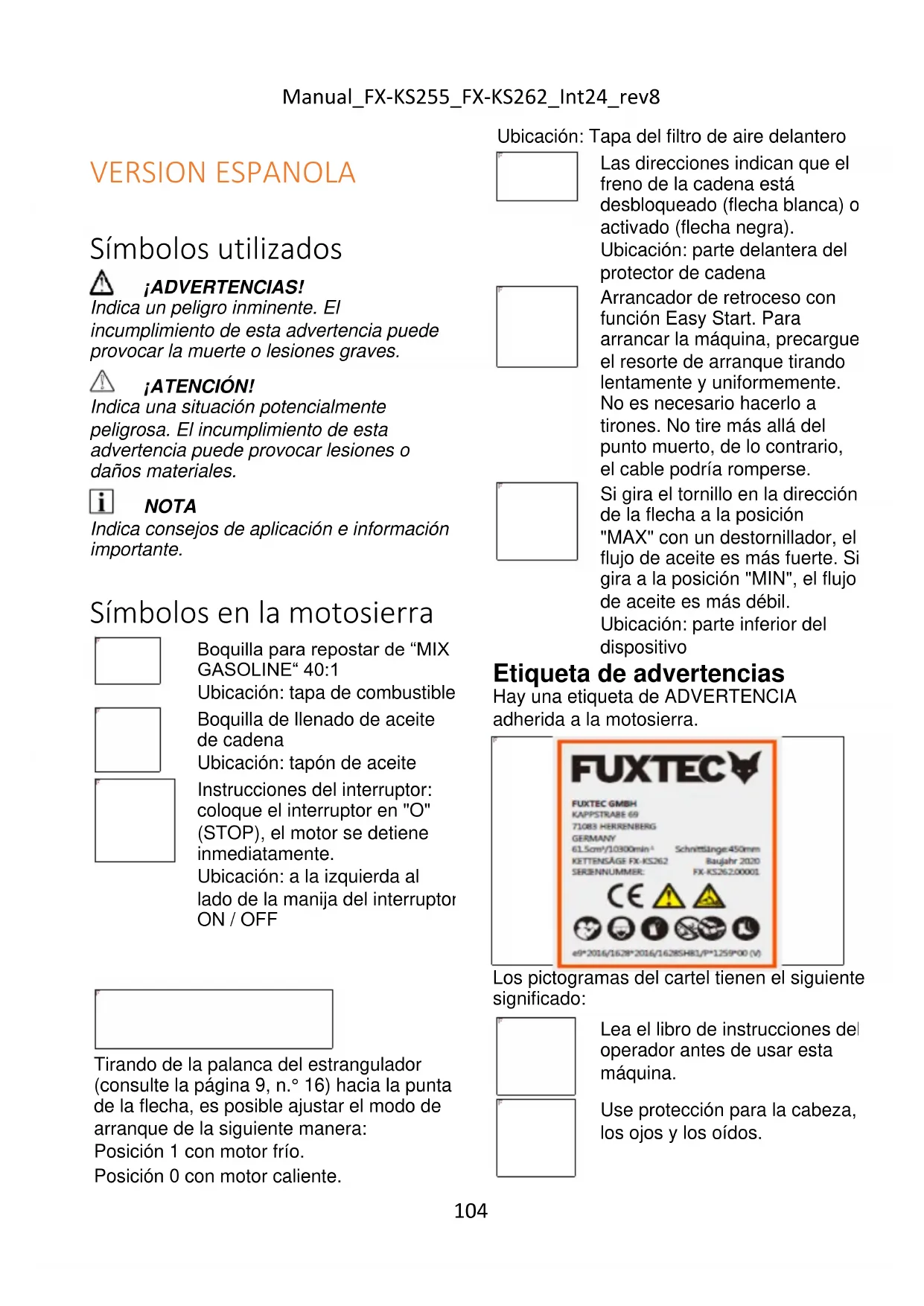 ¡ATENCIÓN! Antes de encender el motor: ¡Coloque el dispositivo en el suelo antes de intentar arrancar el motor, asegurándose de que la cadena no toque el suelo!Manual_FX-KS255_FX-KS262_Int24_rev8
