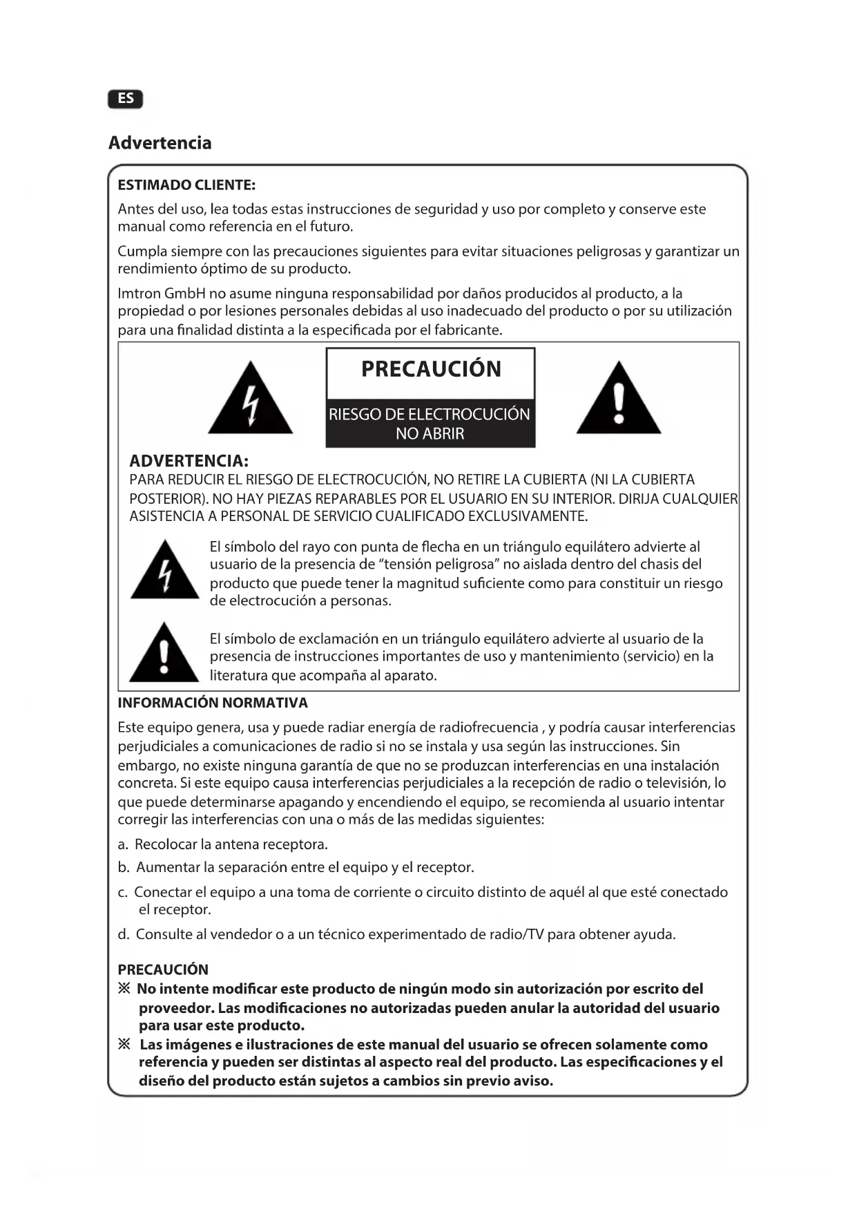 227ES ESTIMADO CLIENTE: Antes del uso, lea todas estas instrucciones de seguridad y uso por completo y conserve este manual como referencia en el futuro. Cumpla siempre con las precauciones siguientes para evitar situaciones peligrosas y garantizar un rendimiento óptimo de su producto. Imtron GmbH no asume ninguna responsabilidad por daños producidos al producto, a la propiedad o por lesiones personales debidas al uso inadecuado del producto o por su utilización para una nalidad distinta a la especicada por el fabricante. Advertencia ADVERTENCIA: PARA REDUCIR EL RIESGO DE ELECTROCUCIÓN, NO RETIRE LA CUBIERTA (NI LA CUBIERTA POSTERIOR). NO HAY PIEZAS REPARABLES POR EL USUARIO EN SU INTERIOR. DIRIJA CUALQUIER ASISTENCIA A PERSONAL DE SERVICIO CUALIFICADO EXCLUSIVAMENTE. El símbolo del rayo con punta de echa en un triángulo equilátero advierte al usuario de la presencia de “tensión peligrosa” no aislada dentro del chasis del producto que puede tener la magnitud suciente como para constituir un riesgo de electrocución a personas. El símbolo de exclamación en un triángulo equilátero advierte al usuario de la presencia de instrucciones importantes de uso y mantenimiento (servicio) en la literatura que acompaña al aparato.