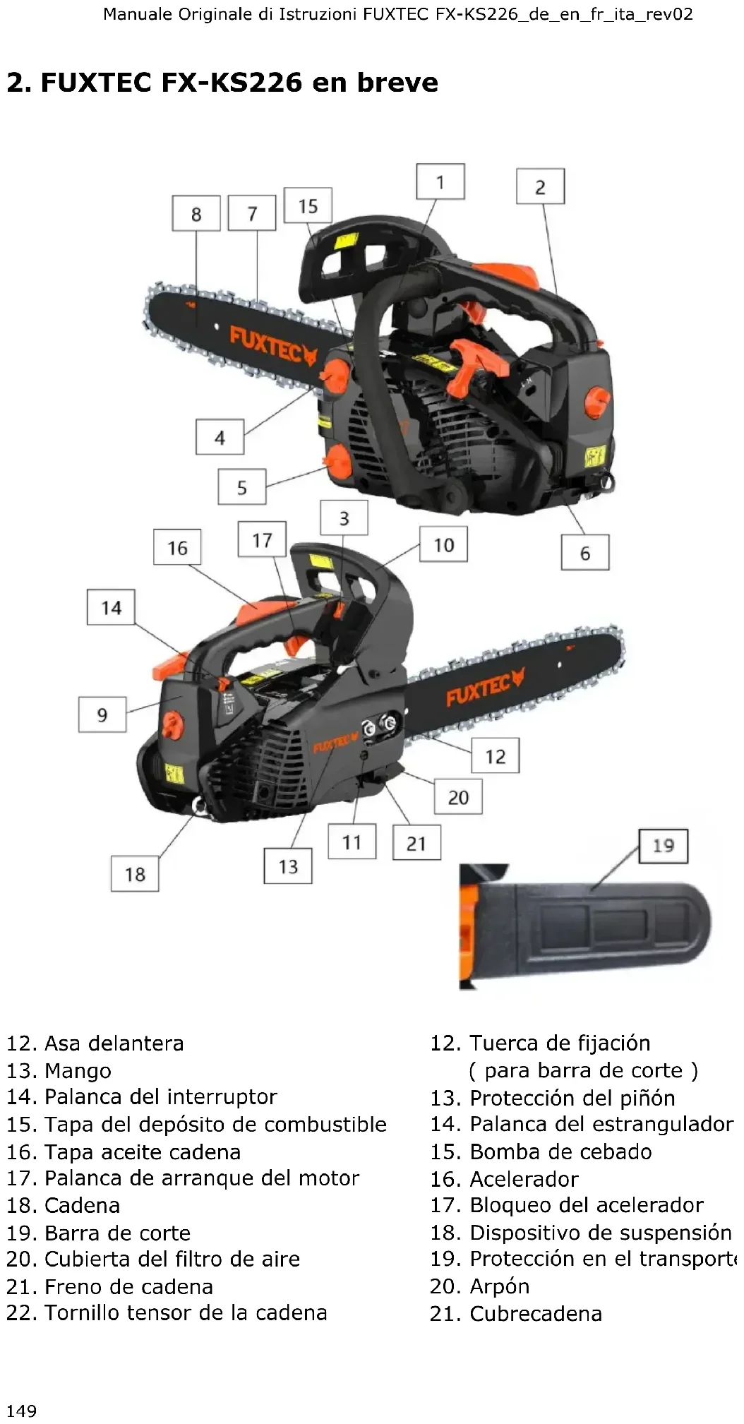 - Compruebe el correcto funcionamiento de la cadena girándola a mano.Manuale Originale di Istruzioni FUXTEC FX-KS226_de_en_fr_ita_rev02