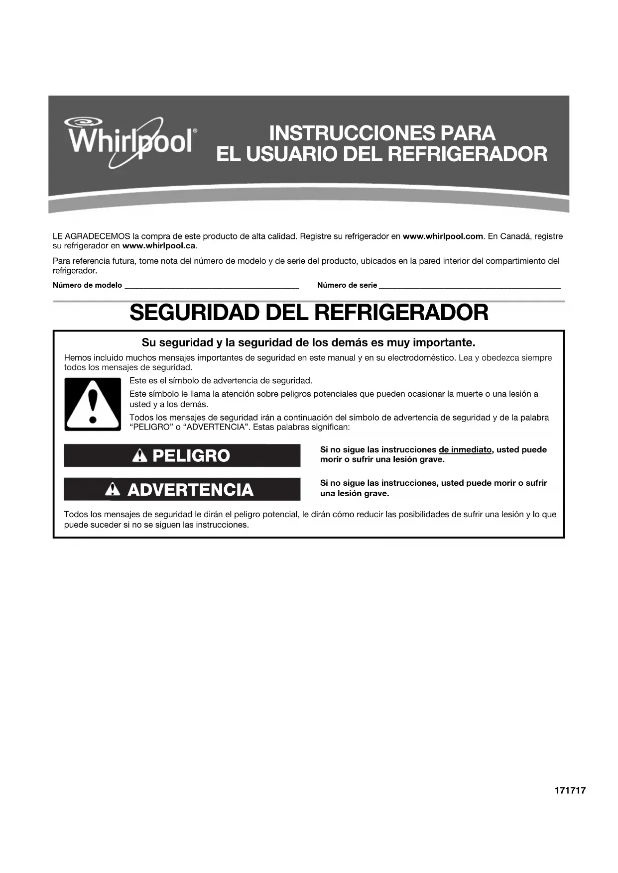 removidos, alterados o no identificados con facilidad. El costo de la reparación o del reemplazo bajo estas circunstancias excluidas correrá por cuenta del cliente. EXCLUSIÓN DE GARANTÍAS IMPLÍCITAS LAS GARANTÍAS IMPLÍCITAS, INCLUYENDO CUALQUIER GARANTÍA IMPLÍCITA DE COMERCIABILIDAD O GARANTÍA IMPLÍCITA DE CAPACIDAD PARA UN PROPÓSITO PARTICULAR, SERÁN LIMITADAS A UN AÑO O AL PERÍODO MÁS CORTO PERMITIDO POR LEY. Algunos estados y provincias no permiten la limitación de la duración de las garantías implícitas de comerciabilidad o capacidad, de modo que la limitación arriba indicada quizá no le corresponda. Esta garantía le otorga derechos legales específicos y es posible que usted tenga también otros derechos que varían de un estado a otro o de una provincia a otra. EXCLUSIÓN DE DECLARACIONES FUERA DE LA GARANTÍA Whirlpool no hace declaraciones acerca de la calidad, durabilidad o necesidad de servicio técnico o reparación de este electrodoméstico principal aparte de las declaraciones incluidas en esta garantía. Si usted desea una garantía con una duración más prolongada o más completa que la garantía limitada que se incluye con este electrodoméstico principal, deberá dirigirse a Whirlpool o a su distribuidor acerca de la compra de una garantía extendida. LIMITACIÓN DE RECURSOS; EXCLUSIÓN DE DAÑOS INCIDENTALES Y CONSECUENTES SU ÚNICO Y EXCLUSIVO RECURSO SEGÚN LOS TÉRMINOS DE ESTA GARANTÍA LIMITADA SERÁ EL DE REPARAR EL PRODUCTO SEGÚN SE ESTIPULA EN LA PRESENTE. WHIRLPOOL NO SE RESPONSABILIZARÁ POR DAÑOS INCIDENTALES O CONSECUENTES. Algunos estados y provincias no permiten la exclusión o limitación de daños incidentales o consecuentes, de modo que estas limitaciones y exclusiones quizás no le correspondan. Esta garantía le otorga derechos legales específicos y es posible que usted tenga también otros derechos que varían de un estado a otro o de una provincia a otra.353535 Nous vous REMERCIONS d'avoir acheté ce produit de haute qualité. Enregistrer votre nouveau réfrigérateur sur le site internet www.whirlpool.ca. Pour référence ultérieure, consigner par écrit les numéros de modèle et de série de votre produit. Ceux-ci sont situés sur la paroi interne du compartiment de réfrigération. Numéro de modèle ______________________________________________ Numéro de série ________________________________________________