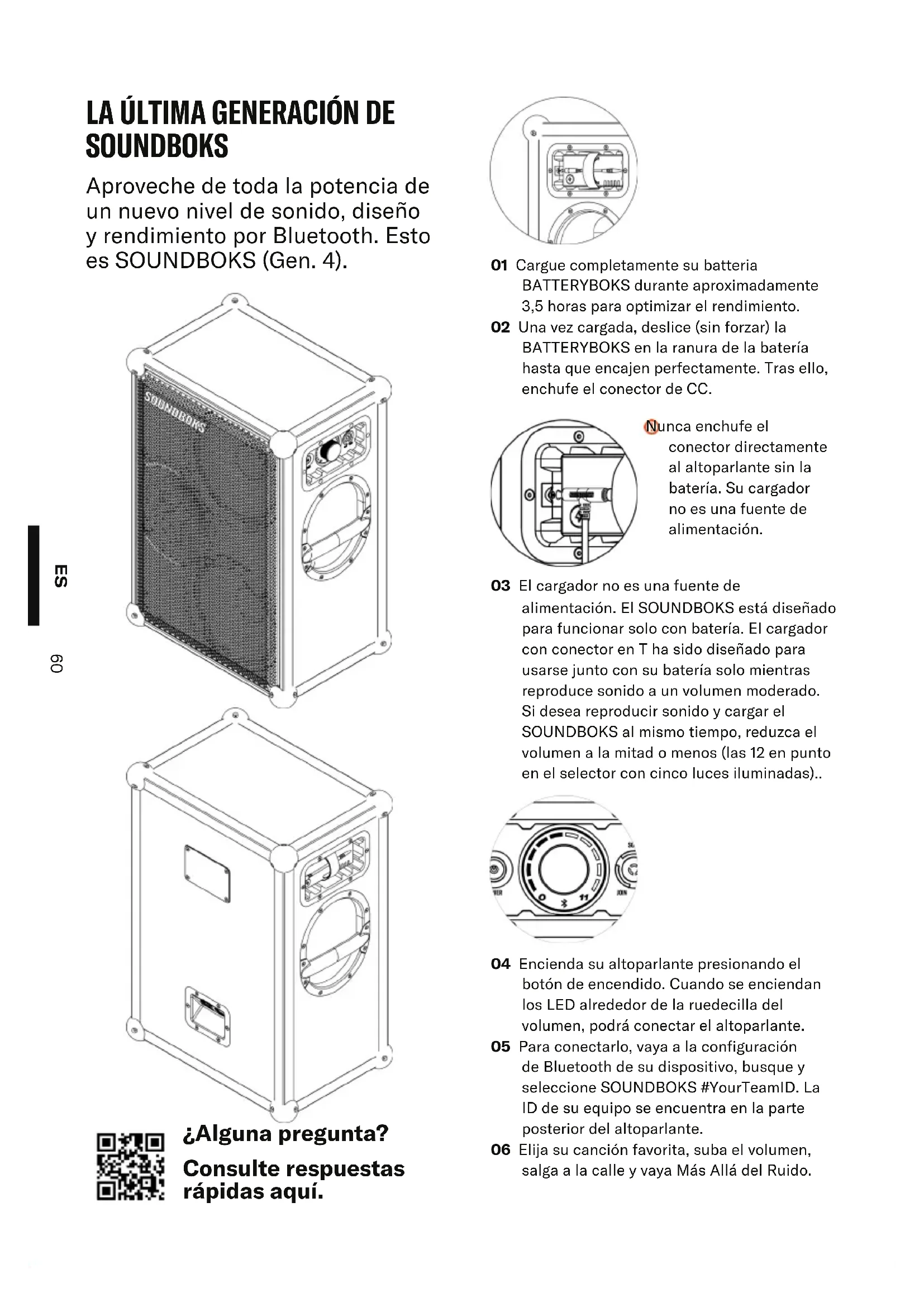 SOUNDBOKS Aproveche de toda la potencia de un nuevo nivel de sonido, diseño y rendimiento por Bluetooth. Esto es SOUNDBOKS (Gen. 4). ¿Alguna pregunta? Consulte respuestas rápidas aquí. 01 Cargue completamente su batteria BATTERYBOKS durante aproximadamente 3,5 horas para optimizar el rendimiento. 02 Una vez cargada, deslice (sin forzar) la BATTERYBOKS en la ranura de la batería hasta que encajen perfectamente. Tras ello, enchufe el conector de CC. Nunca enchufe el conector directamente al altoparlante sin la batería. Su cargador no es una fuente de alimentación. 04 Encienda su altoparlante presionando el botón de encendido. Cuando se enciendan los LED alrededor de la ruedecilla del volumen, podrá conectar el altoparlante. 05 Para conectarlo, vaya a la configuración de Bluetooth de su dispositivo, busque y seleccione SOUNDBOKS #YourTeamID. La ID de su equipo se encuentra en la parte posterior del altoparlante. 06 Elija su canción favorita, suba el volumen, salga a la calle y vaya Más Allá del Ruido. 03 El cargador no es una fuente de alimentación. El SOUNDBOKS está diseñado para funcionar solo con batería. El cargador con conector en T ha sido diseñado para usarse junto con su batería solo mientras reproduce sonido a un volumen moderado. Si desea reproducir sonido y cargar el SOUNDBOKS al mismo tiempo, reduzca el volumen a la mitad o menos (las 12 en punto en el selector con cinco luces iluminadas)..61