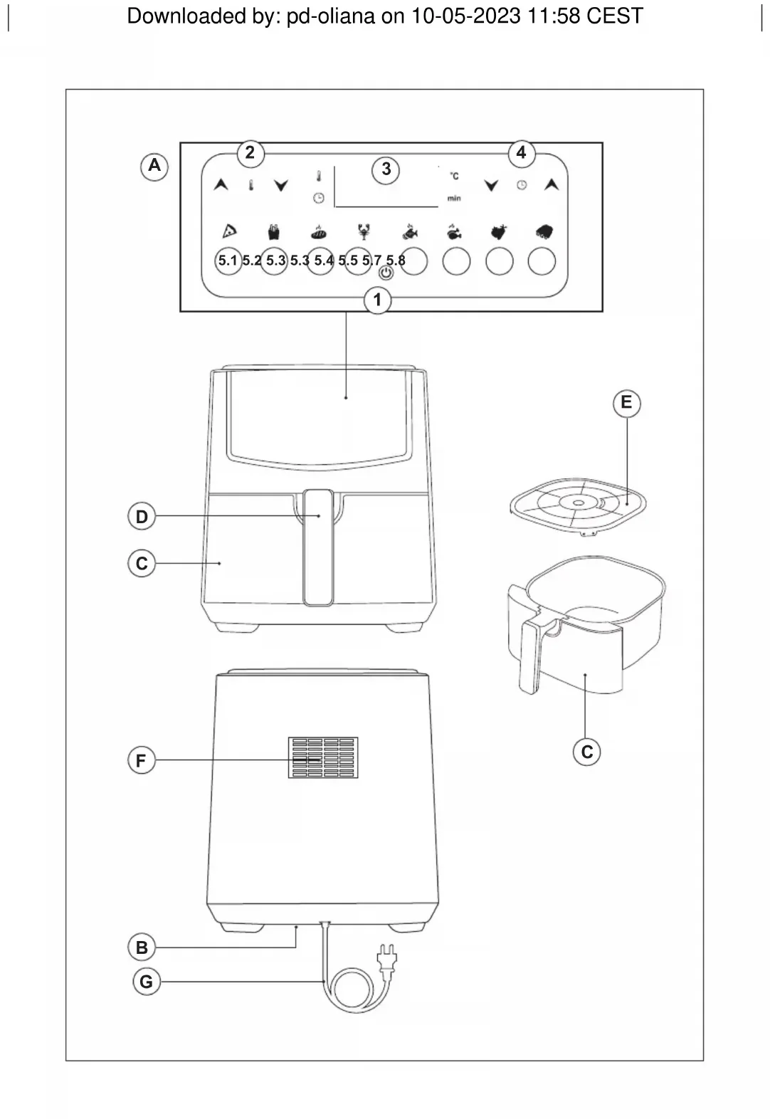 - Nota: manipule la cesta utilizando su asa. No toque la cesta cuando esté caliente. Downloaded by: pd-oliana on 10-05-2023 11:58 CEST• Coloque los ingredientes que desea freír dentro de la cesta (C).