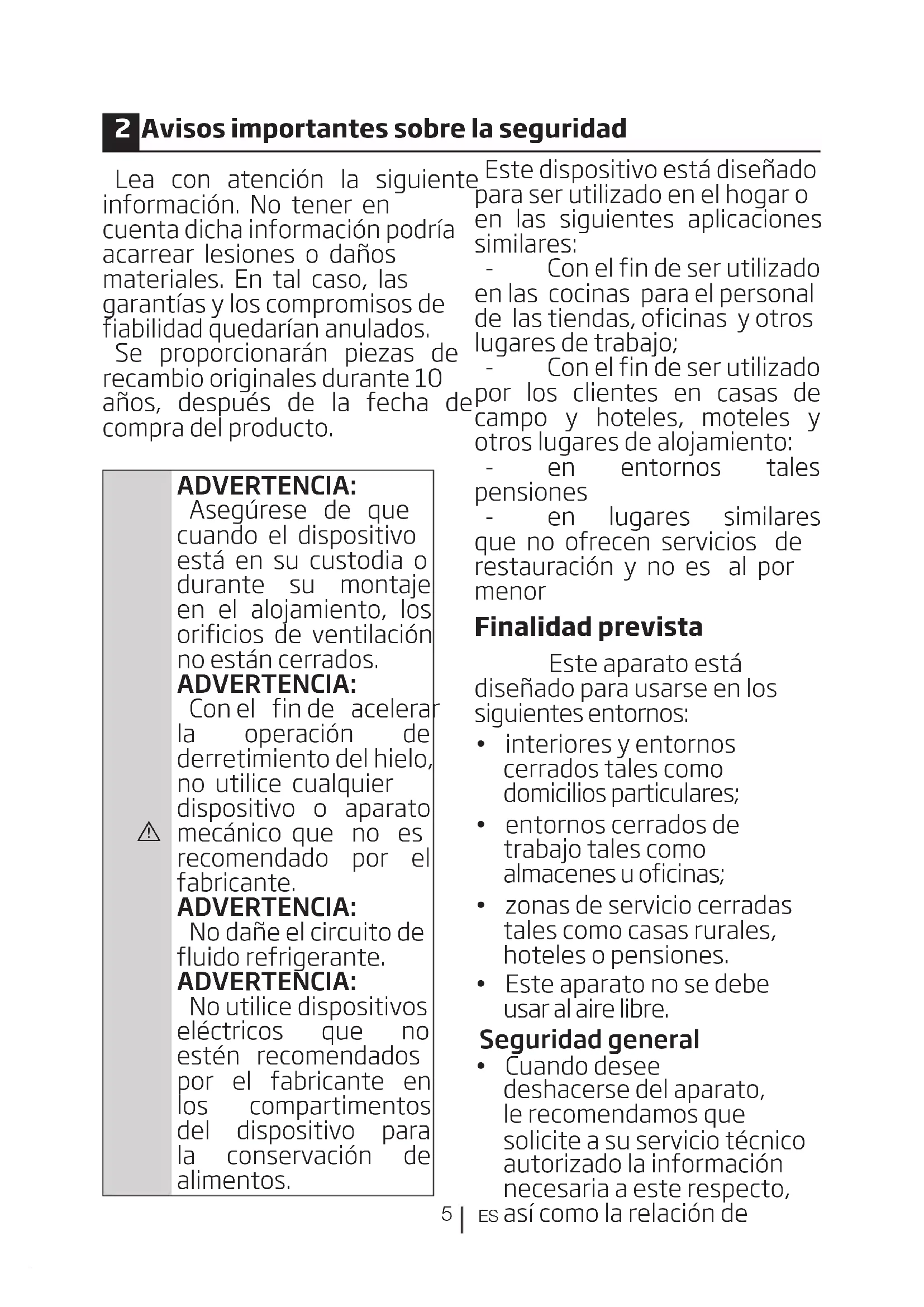 zonas de servicio cerradas tales como casas rurales, hoteles o pensiones. Este aparato no se debe usar al aire libre. Seguridad general