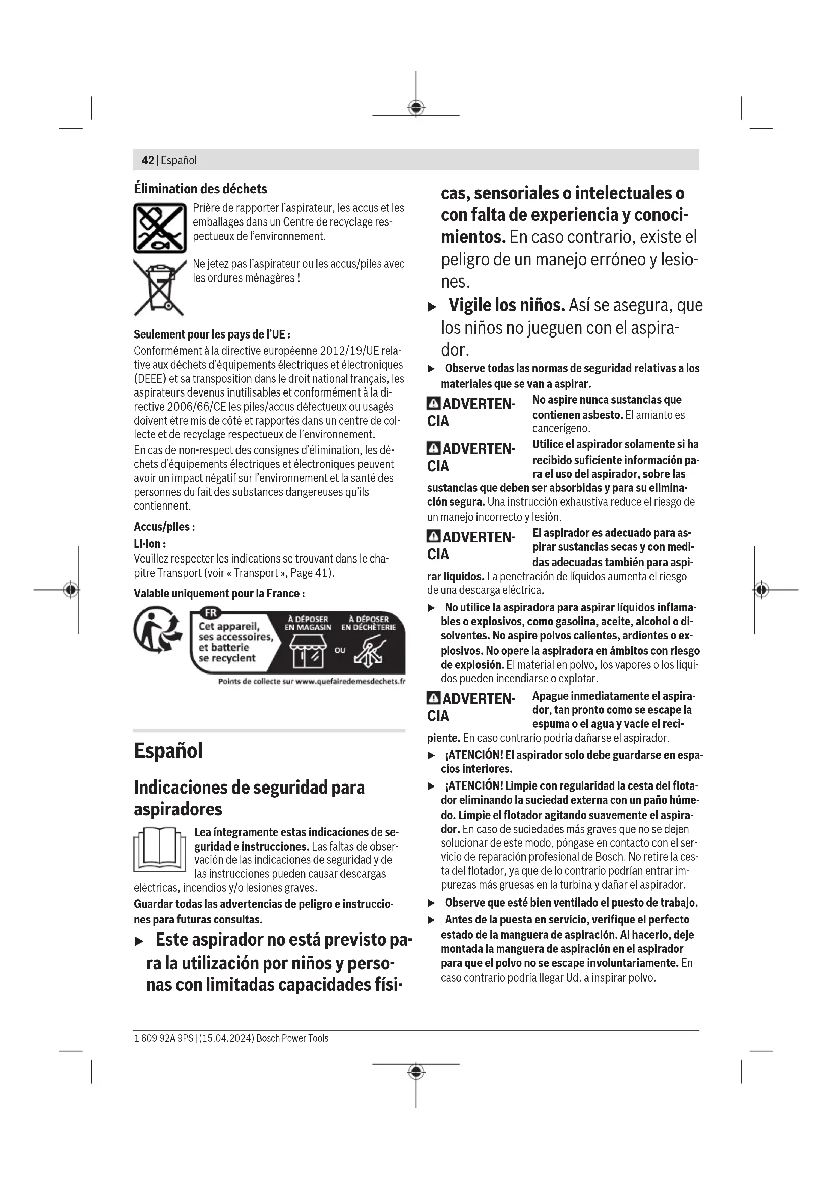 Acumulador Bosch también vende aspiradores sin acumulador. En el em- balaje puede ver si se incluye un acumulador en el volumen de suministro de su aspirador. Carga del acumulador u Utilice únicamente los cargadores que se enumeran en los datos técnicos. Solamente estos cargadores han sido especialmente adaptados a los acumuladores de io- nes de litio empleados en su aspirador. Indicación: Los acumuladores de iones de litio se entregan parcialmente cargados debido a la normativa de transporte internacional. Con el fin de obtener la plena potencia del acumulador, cargue completamente el acumulador antes de su primer uso. Colocar y retirar el acumulador (verfiguraA) u Coloque el acumulador sin ejercer fuerza. El acumula- dor se ha construido de tal manera, que sólo se puede in- troducir en la posición correcta en el aspirador. u Mantenga siempre limpio y seco el alojamiento y el com- partimiento del acumulador para trabajar con eficacia y seguridad. – Presione la tecla de desenclavamiento (19) para abrir la tapa del compartimiento del acumulador (18). – Desplace el acumulador (31) en el alojamiento del acu- mulador (30), hasta que encastre de forma audible. – Para extraer el acumulador (31) presione la tecla de de- senclavamiento en el acumulador y retírelo del alojamien- to (30). – Cierre la tapa del compartimiento del acumulador (18). Indicación: Debido al sistema de limpieza del filtro, el cierre de la tapa del compartimento del acumulador requiere más esfuerzo. Indicador del estado de carga del acumulador Con el acumulador colocado, el estado de carga del acumu- lador lo puede ver en la interfaz de usuario(6) y, con el acu- mulador desmontado, lo puede ver en el propio acumulador. Bosch Power Tools 1 609 92A 9PS | (15.04.2024)46 | Español Indicador del estado de carga del acumulador en el aspirador Después de conectar el aspirador, los 5LEDs verdes en el in- dicador de estado de carga del acumulador(3) en la interfaz de usuario se encienden un por uno de modo ascendente y descendente. A continuación, los LEDs muestran el estado de carga del acumulador(31). Indicador del estado de carga del acumulador en el acumulador Si se retira el acumulador del aspirador, se puede ver el esta- do de carga a través de los LEDs verdes del indicador del es- tado de carga del acumulador. Presione la tecla del indicador de estado de carga o , para indicar el estado de carga. Si tras presionar la tecla del indicador de estado de carga no se enciende ningún LED, significa que el acumulador está defectuoso y debe sustituirse. Indicación: No cada tipo de acumulador dispone de un indi- cador de estado de carga. Tipo de acumulador GBA18V... LEDs Capacidad Luz permanente 3× verde 60−100% Luz permanente 2× verde 30−60% Luz permanente 1× verde 5−30% Luz intermitente 1× verde 0−5% Tipo de acumulador ProCORE18V... LEDs Capacidad Luz permanente 5× verde 80−100 % Luz permanente 4× verde 60−80 % Luz permanente 3× verde 40−60 % Luz permanente 2× verde 20−40 % Luz permanente 1× verde 5−20 % Luz intermitente 1× verde 0−5 % Indicaciones para el trato óptimo del acumulador Proteja el acumulador de la humedad y del agua. Únicamente almacene el acumulador en el margen de tem- peratura desde −20°C hasta 50°C. P.ej., no deje el acumu- lador en el coche en verano. Limpie de vez en cuando las rejillas de refrigeración del acu- mulador con un pincel suave, limpio y seco. Si después de una recarga, el tiempo de funcionamiento del acumulador fuese muy reducido, ello es señal de que éste está agotado y deberá sustituirse. Observe las indicaciones referentes a la eliminación. Montaje u Retire el acumulador antes de realizar tareas de man- tenimiento o limpieza en el aspirador, ajustes del apa- rato, cambiar accesorios o guardar el aspirador. Esta medida preventiva reduce el riesgo de conectar acciden- talmente el aspirador. Colocar el filtro principal (verfiguraB) El filtro principal (32) es un filtro plisado HEPA con un rendi- miento de filtro extremadamente alto para limpiar el aire de salida. – Abra los cierres (13) y retire la parte superior del aspira- dor (15). Indicación: Al desmontar y colocar la parte superior del aspirador(15), preste atención a que las varillas del soporte de bolsas(33) no se doblen ni se rompan. – Coloque el filtro principal(32) sobre la cesta del flotador(34) y gírelo hasta el tope en el sentido de giro en el soporte del filtro(35). – Coloque la parte superior del aspirador (15) y asegure los cierres (13). Indicación: Asegúrese de que el filtro esté siempre correcta- mente montado. Esto rige en particular cuando se aspira pol- vo nocivo. Colocar/quitar la bolsa de plástico (aspiración en seco) (verfiguraC) Indicación: Al desmontar y colocar la parte superior del aspirador(15), preste atención a que las varillas del soporte de bolsas(33) no se doblen ni se rompan. Abra los dos cierres(13) y retire la parte superior del aspirador(15). Para la aspiración en seco, coloque una bolsa de plástico(36) en el depósito(12). Coloque el saco de plástico(36) con la abertura de llenado hacia arriba en el depósito(12)➊. Asegúrese, que el saco de plástico(36) quede completa- mente apoyado en las paredes interiores del depósito(12)➋. Doble el resto del saco de plástico(36) sobre el borde del depósito(12). Vuelva a colocar la parte superior del aspirador(15)➌ y cie- rre el aspirador con los cierres(13). u Preste atención a que el aspirador esté siempre bien cerrado. Indicación: Al colocar la parte superior del aspirador(15), preste atención a que las varillas del soporte de bolsas(33) no perforen la bolsa de plástico (36). Cierre la bolsa de plástico, antes de sacarla. Para ello, retire la cinta blanca de la bolsa de plástico, sujete la bolsa por la parte superior y utilice la cinta para anudar la bolsa. 1 609 92A 9PS | (15.04.2024) Bosch Power ToolsEspañol | 47 Montaje del soporte para accesorios de aspiración Coloq
