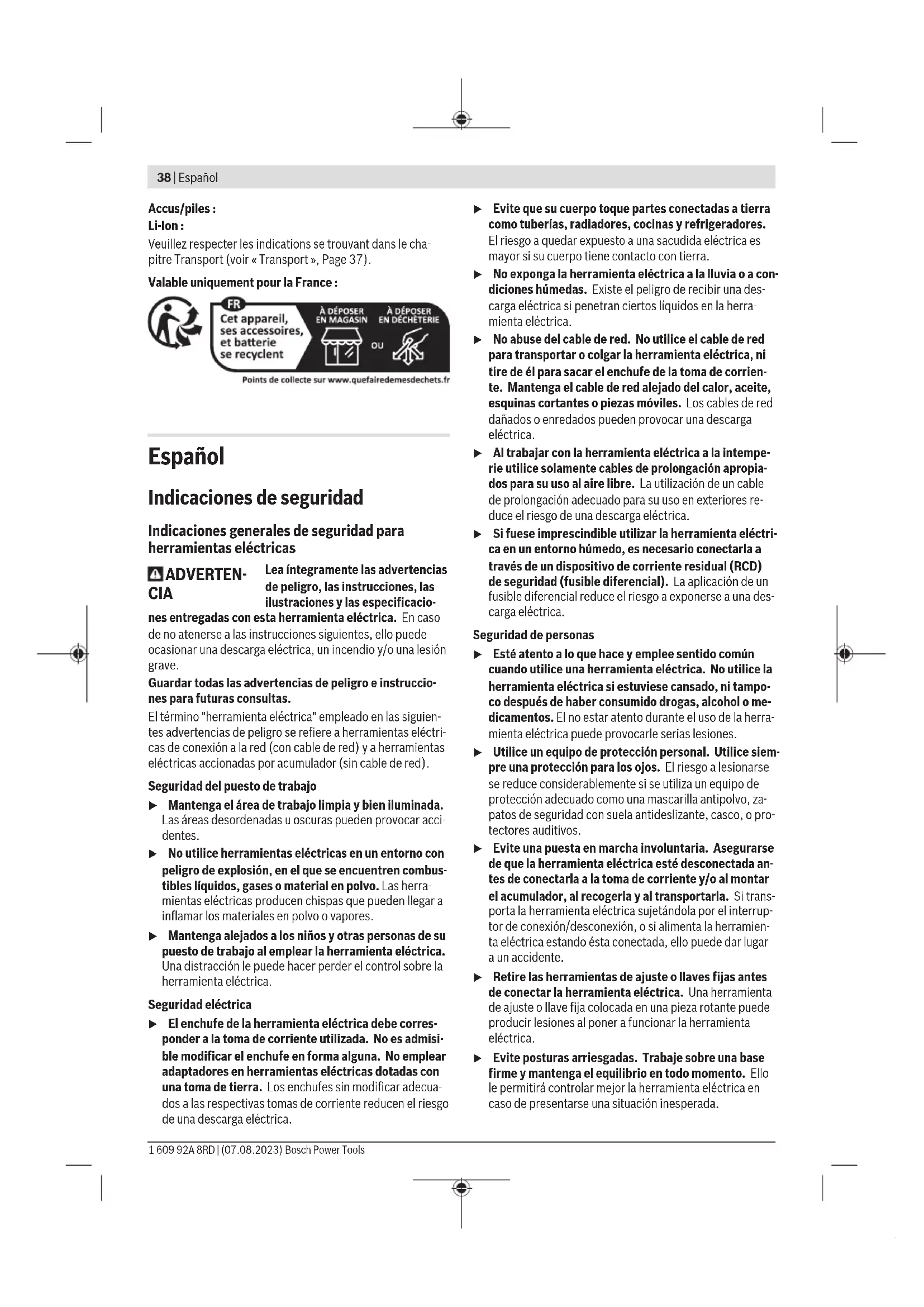 El nivel de vibraciones y el valor de emisiones de ruidos indi- cados en estas instrucciones han sido determinados según un procedimiento de medición normalizado y pueden servir como base de comparación con otras herramientas eléctri- cas. También son adecuados para estimar provisionalmente la emisión de vibraciones y ruidos. El nivel de vibraciones y el valor de emisiones de ruidos indi- cados han sido determinados para las aplicaciones principa- les de la herramienta eléctrica. Por ello, el nivel de vibracio- nes y el valor de emisiones de ruidos pueden ser diferentes si la herramienta eléctrica se utiliza para otras aplicaciones, con útiles diferentes, o si el mantenimiento de la misma fue- se deficiente. Ello puede suponer un aumento drástico de la emisión de vibraciones y de ruidos durante el tiempo total de trabajo. Para determinar con exactitud las emisiones de vibraciones y de ruidos, es necesario considerar también aquellos tiem- pos en los que el aparato esté desconectado, o bien, esté en funcionamiento, pero sin ser utilizado realmente. Ello puede suponer una disminución drástica de las emisiones de vibra- ciones y de ruidos durante el tiempo total de trabajo. Fije unas medidas de seguridad adicionales para proteger al usuario de los efectos por vibraciones, como por ejemplo: Mantenimiento de la herramienta eléctrica y de los útiles, conservar calientes las manos, organización de las secuen- cias de trabajo. Acumulador Bosch también vende herramientas eléctricas accionadas por acumulador sin acumulador. En el embalaje puede ver si un acumulador está incluido en el volumen de suministro de su herramienta eléctrica. Carga del acumulador u Utilice únicamente los cargadores que se enumeran en los datos técnicos. Solamente estos cargadores han sido especialmente adaptados a los acumuladores de io- nes de litio empleados en su herramienta eléctrica. Indicación: Los acumuladores de iones de litio se entregan parcialmente cargados debido a la normativa de transporte internacional. Con el fin de obtener la plena potencia del acumulador, cargue completamente el acumulador antes de su primer uso. Montaje del acumulador Desplace el acumulador cargado en el alojamiento del acu- mulador, hasta que encastre perceptible. Desmontaje del acumulador Para la extracción del acumulador, presione la tecla de de- senclavamiento y retire el acumulador. No proceda con brusquedad. El acumulador dispone de 2etapas de enclavamiento para evitar que se salga en el caso de un accionamiento acciden- tal de la tecla de desenclavamiento del acumulador. Mien- tras la batería esté montada en la herramienta eléctrica, per- manecerá retenida en su posición mediante un resorte. Bosch Power Tools 1 609 92A 8RD | (07.08.2023)42 | Español Indicador del estado de carga del acumulador Indicación: No cada tipo de acumulador dispone de un indi- cador de estado de carga. Los LEDs verdes del indicador del estado de carga del acu- mulador indican el estado de carga del acumulador. Por mo- tivos de seguridad, la consulta del estado de carga es solo posible con la herramienta eléctrica parada. Presione la tecla del indicador de estado de carga o , para indicar el estado de carga. Esto también es posible con el acumulador desmontado. Si tras presionar la tecla del indicador de estado de carga no se enciende ningún LED, significa que el acumulador está defectuoso y debe sustituirse. Tipo de acumulador GBA18V... Diodo luminoso (LED) Capacidad Luz permanente 3× verde 60–100% Luz permanente 2× verde 30–60% Luz permanente 1× verde 5–30% Luz intermitente 1× verde 0–5% Tipo de acumulador ProCORE18V... Diodo luminoso (LED) Capacidad Luz permanente 5× verde 80–100% Luz permanente 4× verde 60–80% Luz permanente 3× verde 40–60% Luz permanente 2× verde 20–40% Luz permanente 1× verde 5–20% Luz intermitente 1× verde 0–5% Indicaciones para el trato óptimo del acumulador Proteja el acumulador de la humedad y del agua. Únicamente almacene el acumulador en el margen de tem- peratura desde −20°C hasta 50°C. P.ej., no deje el acumu- lador en el coche en verano. Limpie de vez en cuando las rejillas de refrigeración del acu- mulador con un pincel suave, limpio y seco. Si después de una recarga, el tiempo de funcionamiento del acumulador fuese muy reducido, ello es señal de que éste está agotado y deberá sustituirse. Observe las indicaciones referentes a la eliminación. Montaje u Desmonte el acumulador antes de manipular la herra- mienta eléctrica (p. ej. en el mantenimiento, cambio de útil, etc.) así como al transportarla y guardarla. En caso contrario podría accidentarse al accionar fortuita- mente el interruptor de conexión/desconexión. Cambio de útil u Use guantes de protección al cambiar las herramien- tas. Podría accidentarse en caso de tocar los útiles. Selección del útil Por favor, observe los útiles previstos para su herramienta eléctrica. Útil GOP18V‑34 En la tabla siguiente se muestran algunos de los útiles a título de ejemplo. Una variedad de útiles adicionales los encontrará en el amplio programa de accesorios Bosch. Útil Material Aplicación AIZ 10 AB Starlock Hoja de sierra de inmersión bimetáli- ca de 10×20mm para madera y me- tal Madera blanda, plásticos blandos, cartón enyesa- do, perfiles de aluminio y metales no férreo de pare- des delgadas, chapas del- gadas, clavos y tornillos no templados Cortes de separación e inmersión pequeños; trabajos de ajuste filigrano en madera; Ejemplo: Cortar ranuras para cables, cortes por inmersión en paneles de yeso, aserrar huecos para cerraduras y ac- cesorios AIZ 32 EPC Starlock Hoja de sierra de inmersión HCS de 32×50mm para madera Madera blanda Cortes con sierra de separación e inmersión sin desgarros gracias al borde de sierra redondo (Curved-Tec); también para aserrar cerca de los bordes, en esquinas y zonas de difícil acceso; ejemplo: corte de inmersión para la instalació