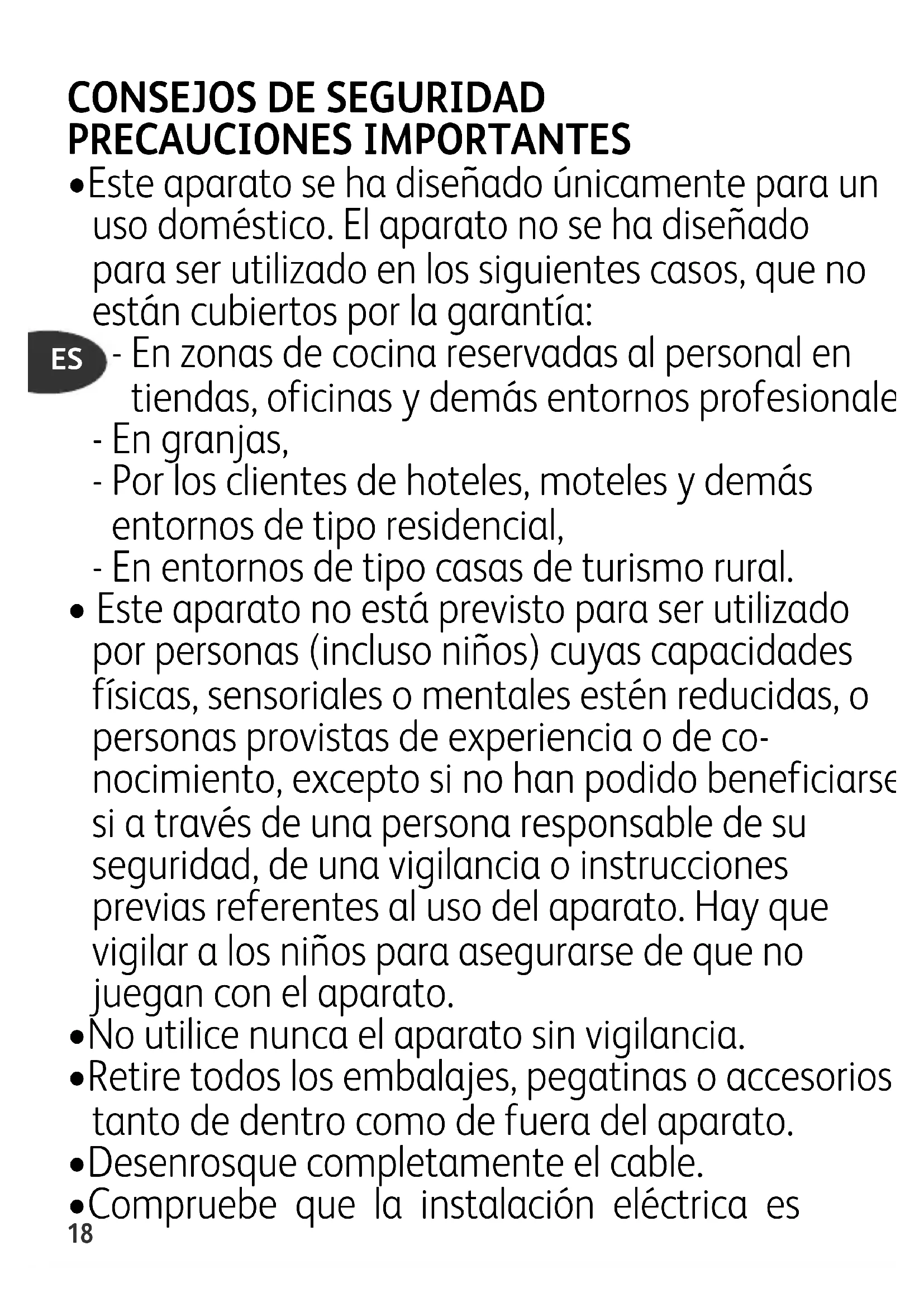 - Este aparato se ha diseñado únicamente para un uso doméstico. El aparato no se ha diseñado para ser utilizado en los siguientes casos, que no están cubiertos por la garantía: - En zonas de cocina reservadas al personal en tiendas, oficinas y demás entornos profesionales, - En granjas, - Por los clientes de hoteles, moteles y demás entornos de tipo residencial, - En entornos de tipo casas de turismo rural.