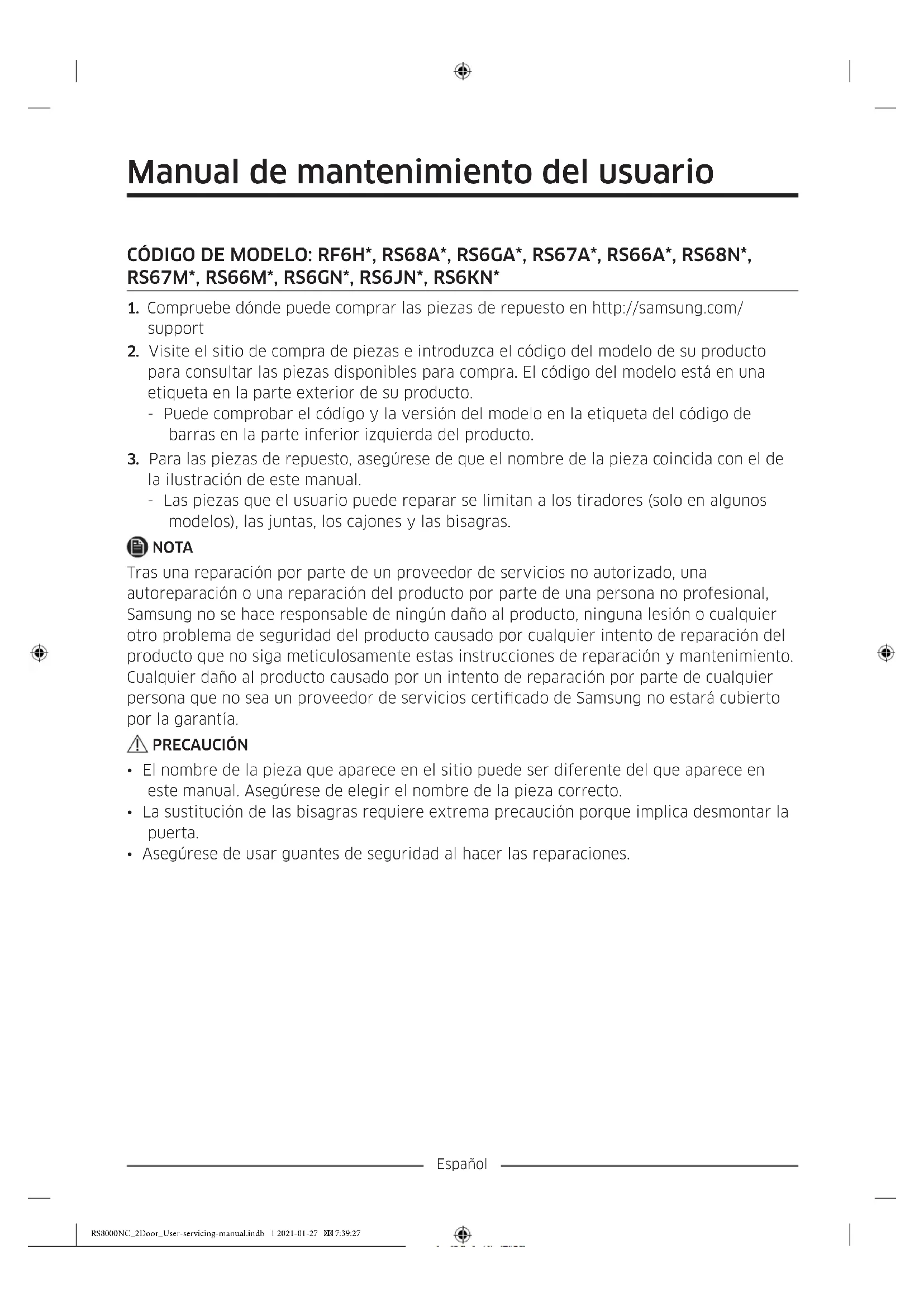 - Asegúrese de usar guantes de seguridad al hacer las reparaciones. RS8000NC_2Door_User-servicing-manual.indb 1 2021-01-27 7:39:27Español La imagen real y las piezas proporcionadas con el frigoríco pueden variar en función del modelo y del país.