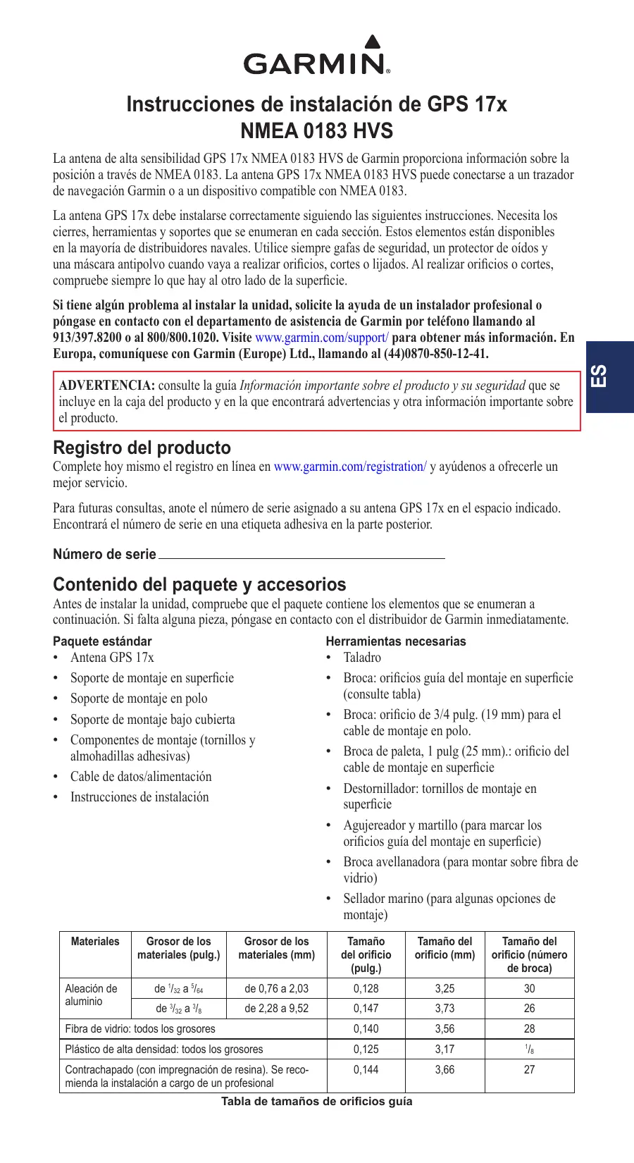 Instrucciones de instalación de GPS 17x NMEA 0183 HVS La antena de alta sensibilidad GPS 17x NMEA 0183 HVS de Garmin proporciona información sobre la posición a través de NMEA 0183. La antena GPS 17x NMEA 0183 HVS puede conectarse a un trazador de navegación Garmin o a un dispositivo compatible con NMEA 0183. La antena GPS 17x debe instalarse correctamente siguiendo las siguientes instrucciones. Necesita los cierres, herramientas y soportes que se enumeran en cada sección. Estos elementos están disponibles en la mayoría de distribuidores navales. Utilice siempre gafas de seguridad, un protector de oídos y una máscara antipolvo cuando vaya a realizar orificios, cortes o lijados. Al realizar orificios o cortes, compruebe siempre lo que hay al otro lado de la superficie.