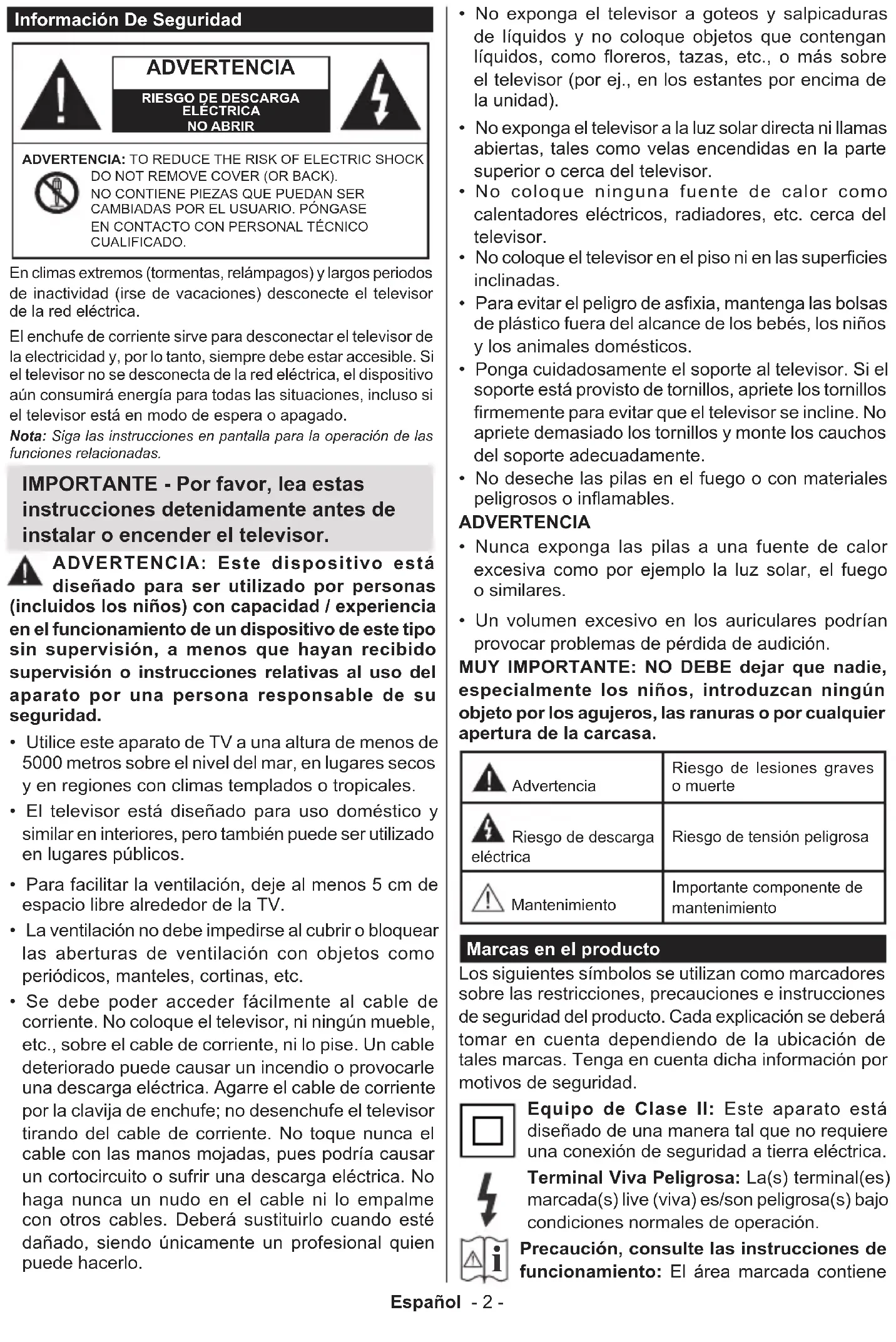 - Un volumen excesivo en los auriculares podrían provocar problemas de pérdida de audición. MUY IMPORTANTE: NO DEBE dejar que nadie, especialmente los niños, introduzcan ningún objeto por los agujeros, las ranuras o por cualquier apertura de la carcasa. Advertencia Riesgo de lesiones graves o muerte Riesgo de descarga eléctrica Riesgo de tensión peligrosa Mantenimiento Importante componente de mantenimiento Marcas en el producto Los siguientes símbolos se utilizan como marcadores sobre las restricciones, precauciones e instrucciones de seguridad del producto. Cada explicación se deberá tomar en cuenta dependiendo de la ubicación de tales marcas. Tenga en cuenta dicha información por motivos de seguridad. Equipo de Clase II: Este aparato está diseñado de una manera tal que no requiere una conexión de seguridad a tierra eléctrica. Terminal Viva Peligrosa: La(s) terminal(es) marcada(s) live (viva) es/son peligrosa(s) bajo condiciones normales de operación.
