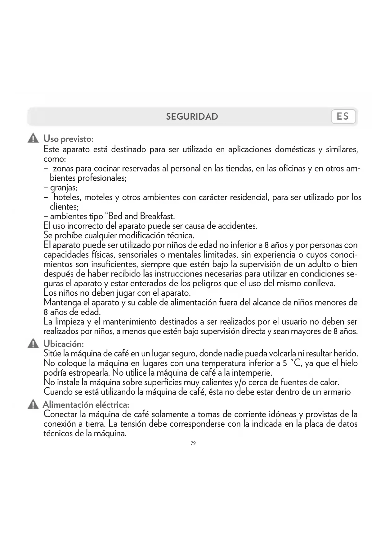SEGURIDAD Uso previsto: Este aparato está destinado para ser utilizado en aplicaciones domésticas y similares, como: – zonas para cocinar reservadas al personal en las tiendas, en las oficinas y en otros am- bientes profesionales; – granjas; – hoteles, moteles y otros ambientes con carácter residencial, para ser utilizado por los clientes; – ambientes tipo “Bed and Breakfast. El uso incorrecto del aparato puede ser causa de accidentes. Se prohíbe cualquier modificación técnica. El aparato puede ser utilizado por niños de edad no inferior a 8 años y por personas con capacidades físicas, sensoriales o mentales limitadas, sin experiencia o cuyos conoci- mientos son insuficientes, siempre que estén bajo la supervisión de un adulto o bien después de haber recibido las instrucciones necesarias para utilizar en condiciones se- guras el aparato y estar enterados de los peligros que el uso del mismo conlleva. Los niños no deben jugar con el aparato. Mantenga el aparato y su cable de alimentación fuera del alcance de niños menores de 8 años de edad. La limpieza y el mantenimiento destinados a ser realizados por el usuario no deben ser realizados por niños, a menos que estén bajo supervisión directa y sean mayores de 8 años. Ubicación: Sitúe la máquina de café en un lugar seguro, donde nadie pueda volcarla ni resultar herido. No coloque la máquina en lugares con una temperatura inferior a 5 °C, ya que el hielo podría estropearla. No utilice la máquina de café a la intemperie. No instale la máquina sobre superficies muy calientes y/o cerca de fuentes de calor. Cuando se está utilizando la máquina de café, ésta no debe estar dentro de un armario Alimentación eléctrica: Conectar la máquina de café solamente a tomas de corriente idóneas y provistas de la conexión a tierra. La tensión debe corresponderse con la indicada en la placa de datos técnicos de la máquina.80 ITES SEGURIDAD Cable de alimentación: No utilice la máquina de café si el cable de alimentación es defectuoso. Si el cable de alimentación está dañado, debe ser sustituido por el fabricante, por el servicio de asistencia técnica, para evitar cualquier riesgo. No dejar que el ca- ble de alimentación pase por esquinas o aristas cortantes o sobre objetos muy calientes. No transportar o tirar de la máquina de café sujetándola por el cable. No desconectar la clavija tirando del cable; no tocarla con las manos mojadas. Evitar que el cable de alimentación caiga libremente desde mesas o estanterías. Peligro de electrocución: No permitir que las partes sujetas a tensión eléctrica entren en contacto con el agua. Este aparato no debe sumergirse. Proteger a los niños menores de 8 años de edad: Vigile a los niños para evitar que jueguen con el aparato. Los niños no se dan cuenta del peligro que entrañan los electrodomésticos. No deje a su alcance los materiales utilizados para embalar la máquina. Peligro de quemaduras: No toque las piezas calientes (porta cápsulas, etc.) justo después de utilizar el aparato. Durante la preparación del café, tenga cuidado con las posibles salpica- duras de líquido caliente. Limpieza: Antes de limpiar la máquina, es indispensable que desconecte la clavija de la toma de corriente y que espere a que la máquina se enfríe. ¡No sumerja la máquina en agua! Está totalmente prohibido manipular el interior de la máquina. Cambiar el agua en el depósito después de 3 días de no utilizar la máquina de café. Para no dañar el aparato durante la limpieza, no utilizar deter- gentes alcalinos sino un paño suave y un detergente delicado.81