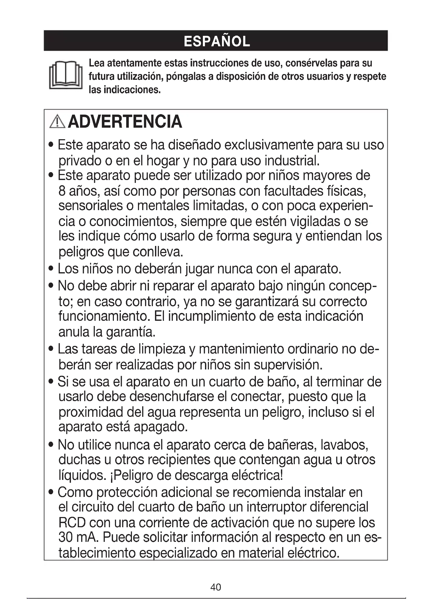 - Si se usa el aparato en un cuarto de baño, al terminar de usarlo debe desenchufarse el conectar, puesto que la proximidad del agua representa un peligro, incluso si el aparato está apagado.