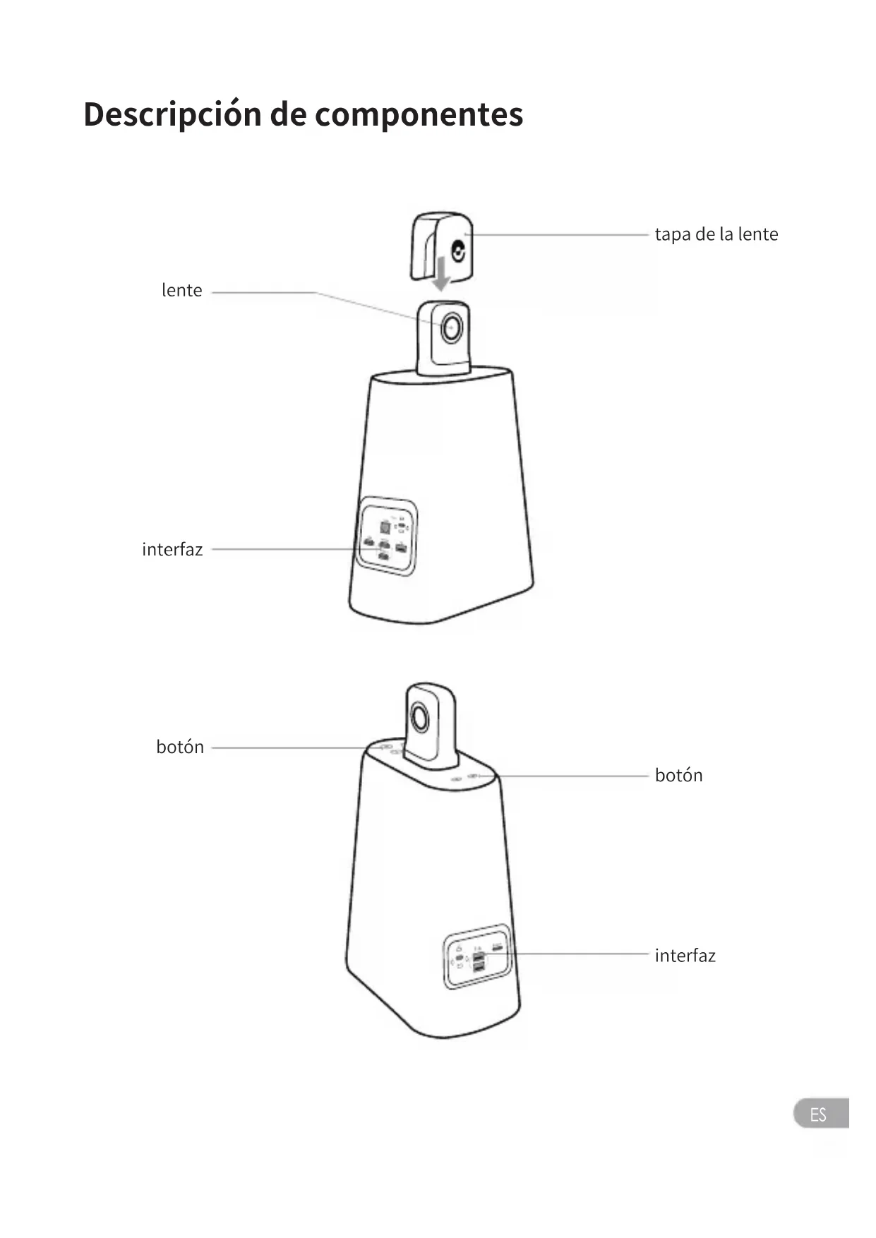 Descripción de componentes tapa de la lente lente botón interfaz botón interfazES Descripción de claves Tecla de modo Tecla de ajuste de volumen Botón de silenciar Tecla de encendido Presione la ventana emergente para solicitar la opción Apagar / Reiniciar y cuenta regresiva. Pulse de nuevo para apagar el dispositivo. Ajustar el volumen de la bocina Presiona el micrófono para silenciarlo Pulsación corta para cambiar el modo de pantalla Mantenga presionado durante segundos para bloquear el ángulo de la pantallaES Descripción de luz indicadora Parpadeo de luz verde El sistema se está encendien- do o actualizando Verde fijo Está listo Parpadeo de luz azul Se está grabando Azul fijo Cámara está funcionando Rojo fijo Micrófono está en silencioES Descripción de interfaz Puerto de Ethernet Alimentación USB-C HDMI IN USB-A Port HDMI OUT Conecte la imagen de salida del monitor/TV Conecta a un ratón o un teclado Conecta a un puerto Ethernet y suministra alimentación a los dispositivos a través del puerto Ethernet (PoE). Conecte un PC para ingresar video y comparta el contenido de la pantalla de un PC externo Suministra alimentación al dispositivo a través de un adaptador de corriente y un cable de alimentación Candado de seguridad Kensington Para dispositivos antirroboES