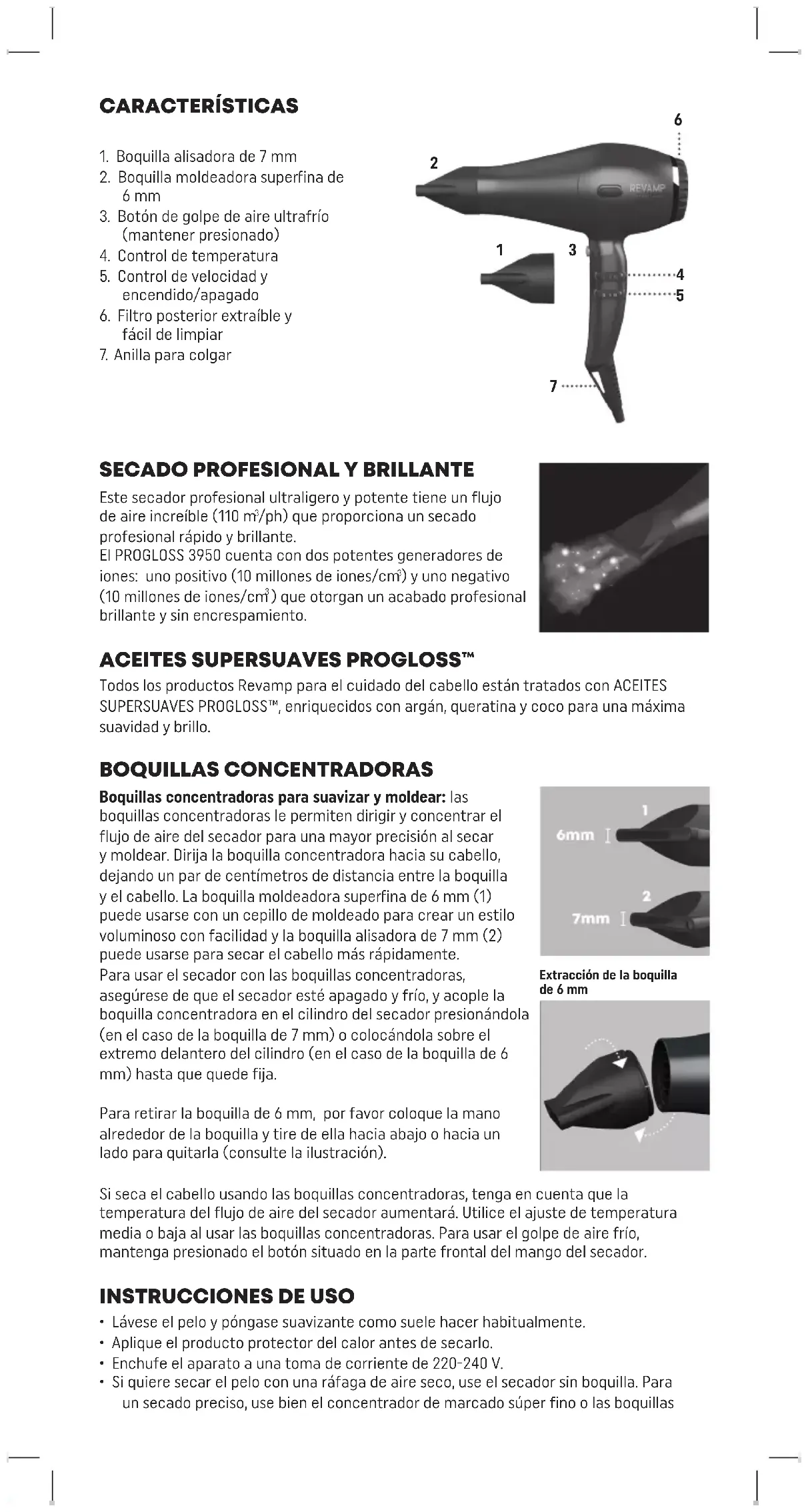 Todos los productos Revamp para el cuidado del cabello están tratados con ACEITES SUPERSUAVES PROGLOSS™, enriquecidos con argán, queratina y coco para una máxima suavidad y brillo. BOQUILLAS CONCENTRADORAS Boquillas concentradoras para suavizar y moldear: las boquillas concentradoras le permiten dirigir y concentrar el flujo de aire del secador para una mayor precisión al secar y moldear. Dirija la boquilla concentradora hacia su cabello, dejando un par de centímetros de distancia entre la boquilla y el cabello. La boquilla moldeadora supeina de 6 mm (1) puede usarse con un cepillo de moldeado para crear un estilo voluminoso con facilidad y la boquilla alisadora de 7 mm (2) puede usarse para secar el cabello más rápidamente. Para usar el secador con las boquillas concentradoras, asegúrese de que el secador esté apagado y frío, y acople la boquilla concentradora en el cilindro del secador presionándola (en el caso de la boquilla de 7 mm) o colocándola sobre el extremo delantero del cilindro (en el caso de la boquilla de 6 mm) hasta que quede fija. Para retirar la boquilla de 6 mm, por favor coloque la mano alrededor de la boquilla y tire de ella hacia abajo o hacia un lado para quitarla (consulte la ilustración). Si seca el cabello usando las boquillas concentradoras, tenga en cuenta que la temperatura del flujo de aire del secador aumentará. Utilice el ajuste de temperatura media o baja al usar las boquillas concentradoras. Para usar el golpe de aire frío, mantenga presionado el botón situado en la pae frontal del mango del secador.
