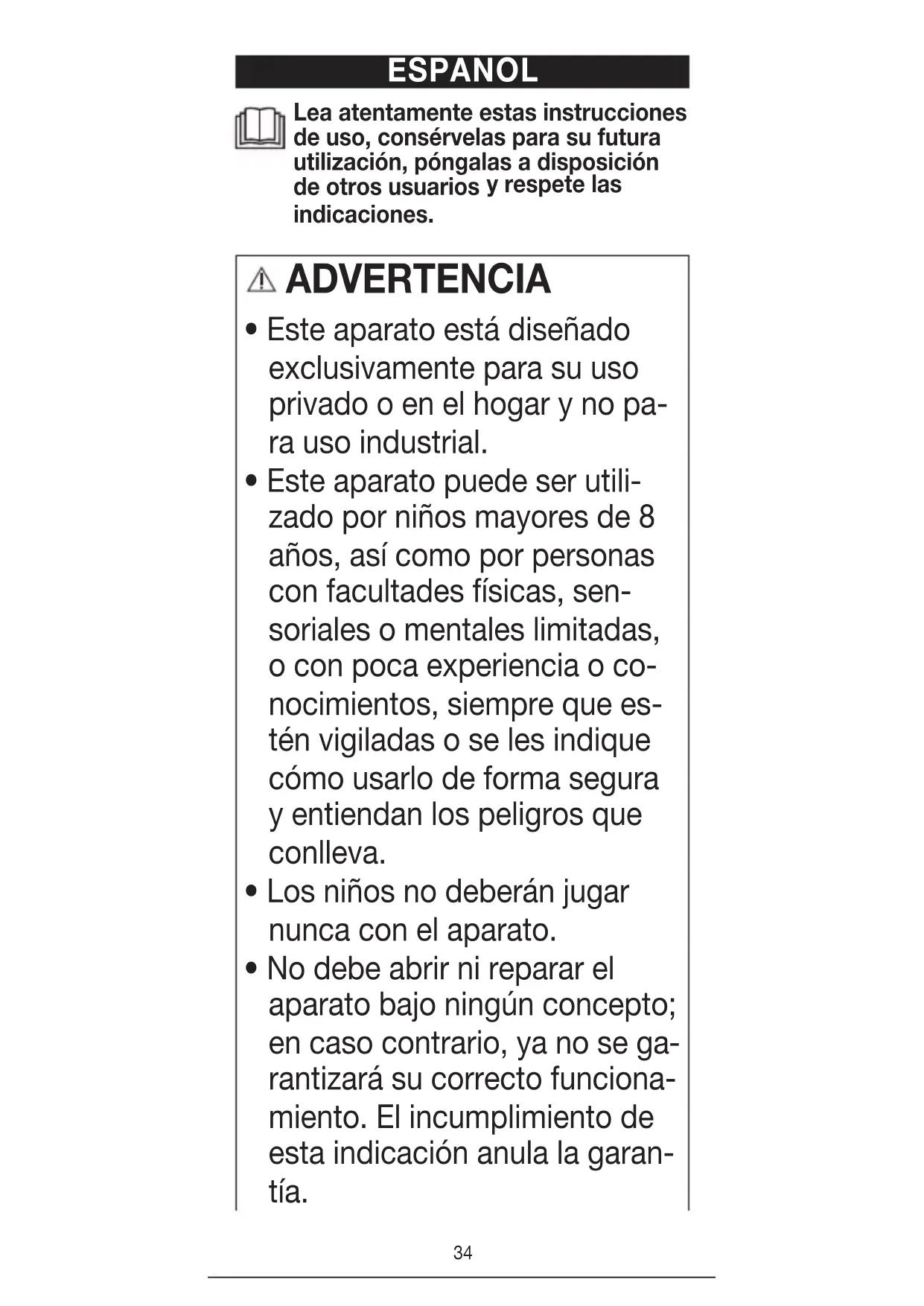 rantizará su correcto funciona- miento. El incumplimiento de esta indicación anula la garan- tía.35