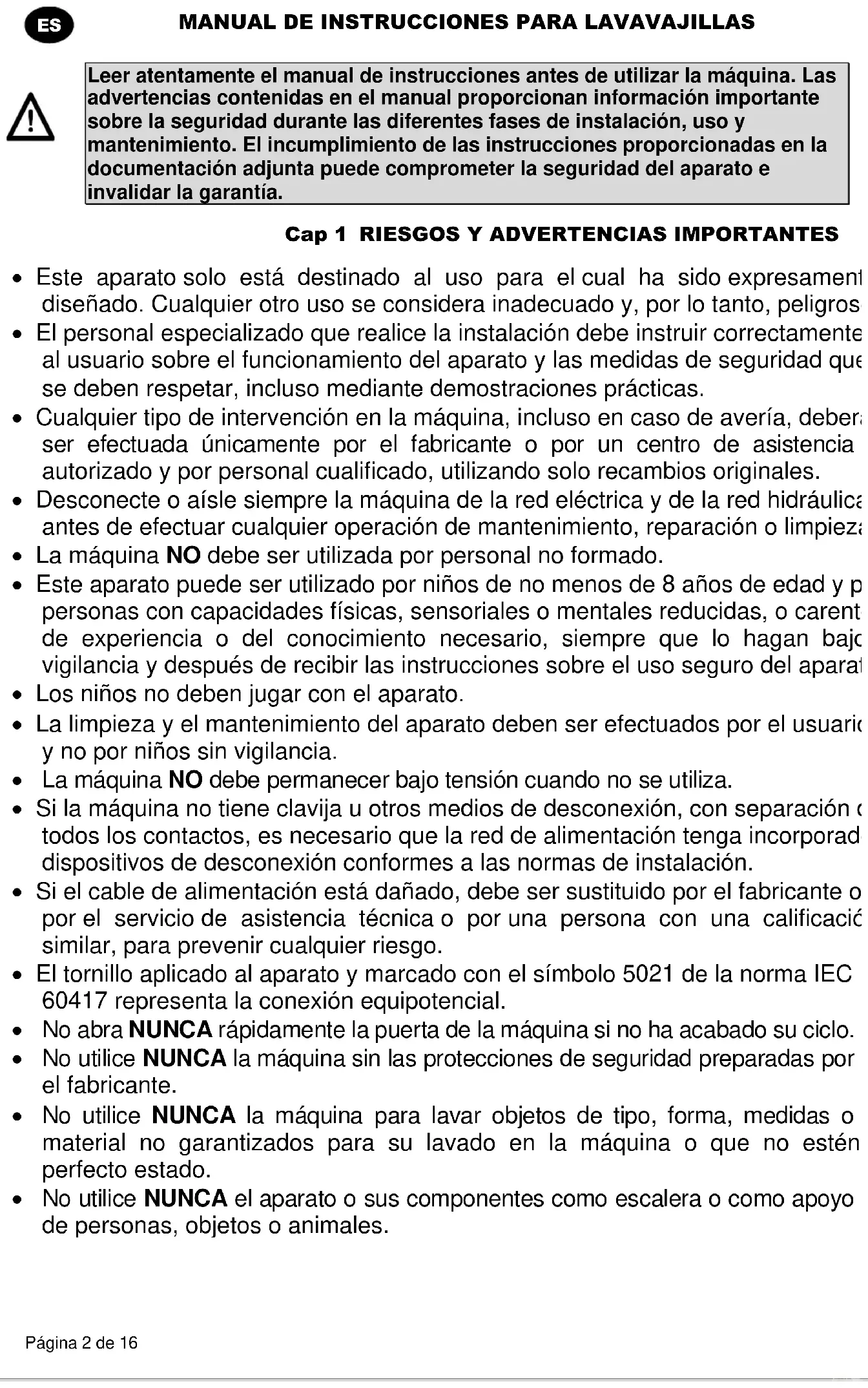 Leer atentamente el manual de instrucciones antes de utilizar la máquina. Las advertencias contenidas en el manual proporcionan información importante sobre la seguridad durante las diferentes fases de instalación, uso y mantenimiento. El incumplimiento de las instrucciones proporcionadas en la documentación adjunta puede comprometer la seguridad del aparato e invalidar la garantía. Cap 1 RIESGOS Y ADVERTENCIAS IMPORTANTES Este aparato solo está destinado al uso para el cual ha sido expresamente diseñado. Cualquier otro uso se considera inadecuado y, por lo tanto, peligroso. El personal especializado que realice la instalación debe instruir correctamente al usuario sobre el funcionamiento del aparato y las medidas de seguridad que se deben respetar, incluso mediante demostraciones prácticas. Cualquier tipo de intervención en la máquina, incluso en caso de avería, deberá ser efectuada únicamente por el fabricante o por un centro de asistencia autorizado y por personal cualificado, utilizando solo recambios originales. Desconecte o aísle siempre la máquina de la red eléctrica y de la red hidráulica antes de efectuar cualquier operación de mantenimiento, reparación o limpieza. La máquina NO debe ser utilizada por personal no formado. Este aparato puede ser utilizado por niños de no menos de 8 años de edad y por personas con capacidades físicas, sensoriales o mentales reducidas, o carentes de experiencia o del conocimiento necesario, siempre que lo hagan bajo vigilancia y después de recibir las instrucciones sobre el uso seguro del aparato. Los niños no deben jugar con el aparato. La limpieza y el mantenimiento del aparato deben ser efectuados por el usuario y no por niños sin vigilancia. La máquina NO debe permanecer bajo tensión cuando no se utiliza. Si la máquina no tiene clavija u otros medios de desconexión, con separación de todos los contactos, es necesario que la red de alimentación tenga incorporados dispositivos de desconexión conformes a las normas de instalación. Si el cable de alimentación está dañado, debe ser sustituido por el fabricante o por el servicio de asistencia técnica o por una persona con una calificación similar, para prevenir cualquier riesgo. El tornillo aplicado al aparato y marcado con el símbolo 5021 de la norma IEC 60417 representa la conexión equipotencial. No abra NUNCA rápidamente la puerta de la máquina si no ha acabado su ciclo. No utilice NUNCA la máquina sin las protecciones de seguridad preparadas por el fabricante. No utilice NUNCA la máquina para lavar objetos de tipo, forma, medidas o material no garantizados para su lavado en la máquina o que no estén en perfecto estado. No utilice NUNCA el aparato o sus componentes como escalera o como apoyo de personas, objetos o animales.MANUAL DE INSTRUCCIONES PARA LAVAVAJILLAS Página 3 de 16