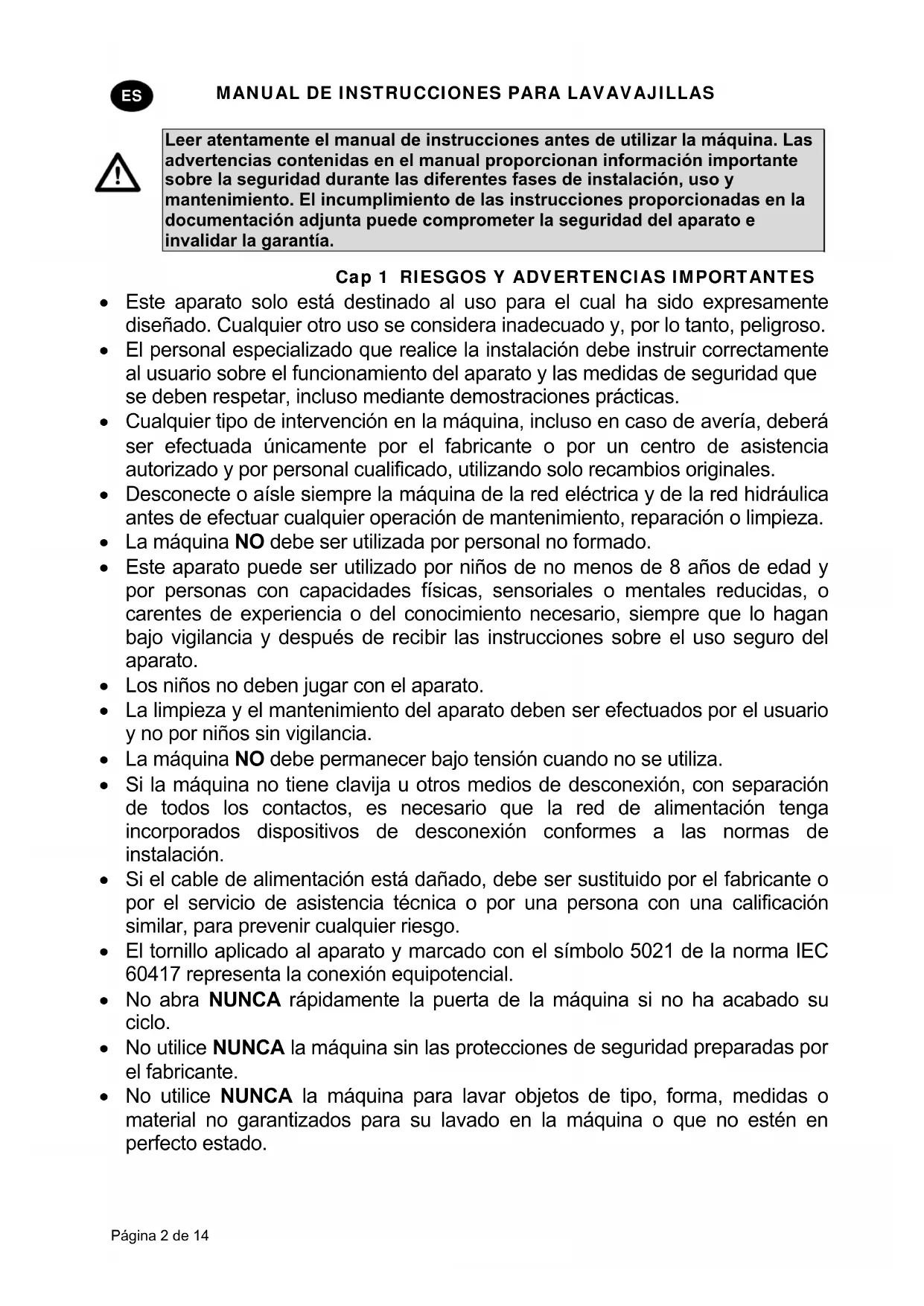 Este aparato solo está destinado al uso para el cual ha sido expresamente diseñado. Cualquier otro uso se considera inadecuado y, por lo tanto, peligroso. El personal especializado que realice la instalación debe instruir correctamente al usuario sobre el funcionamiento del aparato y las medidas de seguridad que se deben respetar, incluso mediante demostraciones prácticas. Cualquier tipo de intervención en la máquina, incluso en caso de avería, deberá ser efectuada únicamente por el fabricante o por un centro de asistencia autorizado y por personal cualificado, utilizando solo recambios originales. Desconecte o aísle siempre la máquina de la red eléctrica y de la red hidráulica antes de efectuar cualquier operación de mantenimiento, reparación o limpieza. La máquina NO debe ser utilizada por personal no formado. Este aparato puede ser utilizado por niños de no menos de 8 años de edad y por personas con capacidades físicas, sensoriales o mentales reducidas, o carentes de experiencia o del conocimiento necesario, siempre que lo hagan bajo vigilancia y después de recibir las instrucciones sobre el uso seguro del aparato. Los niños no deben jugar con el aparato. La limpieza y el mantenimiento del aparato deben ser efectuados por el usuario y no por niños sin vigilancia. La máquina NO debe permanecer bajo tensión cuando no se utiliza. Si la máquina no tiene clavija u otros medios de desconexión, con separación de todos los contactos, es necesario que la red de alimentación tenga incorporados dispositivos de desconexión conformes a las normas de instalación. Si el cable de alimentación está dañado, debe ser sustituido por el fabricante o por el servicio de asistencia técnica o por una persona con una calificación similar, para prevenir cualquier riesgo. El tornillo aplicado al aparato y marcado con el símbolo 5021 de la norma IEC 60417 representa la conexión equipotencial. No abra NUNCA rápidamente la puerta de la máquina si no ha acabado su ciclo. No utilice NUNCA la máquina sin las protecciones de seguridad preparadas por el fabricante. No utilice NUNCA la máquina para lavar objetos de tipo, forma, medidas o material no garantizados para su lavado en la máquina o que no estén en perfecto estado.MANUAL DE INSTRUCCIONES PARA LAVAVAJILLAS Página 3 de 14