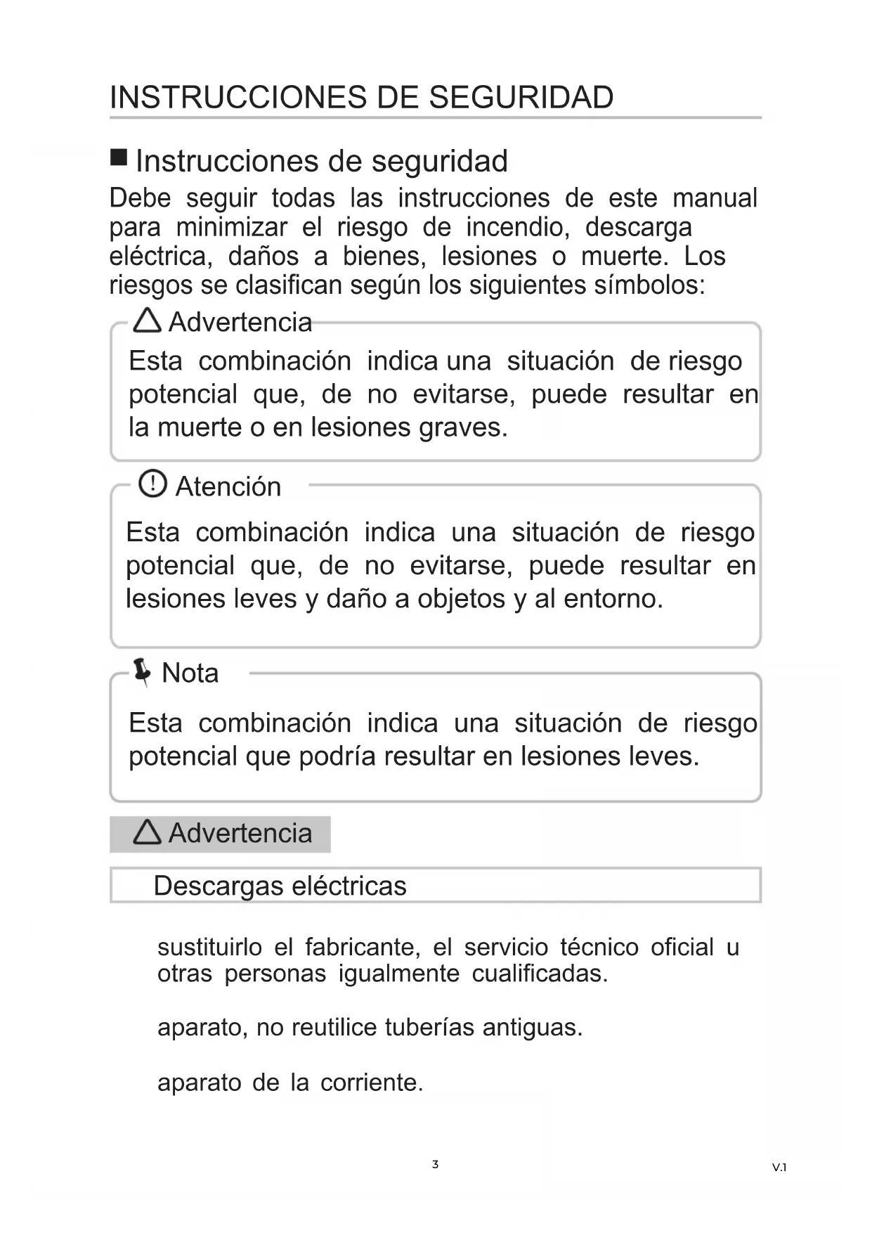 Instrucciones de seguridad Debe seguir todas las instrucciones de este manual para minimizar el riesgo de incendio, descarga eléctrica, daños a bienes, lesiones o muerte. Los riesgos se clasifican según los siguientes símbolos: