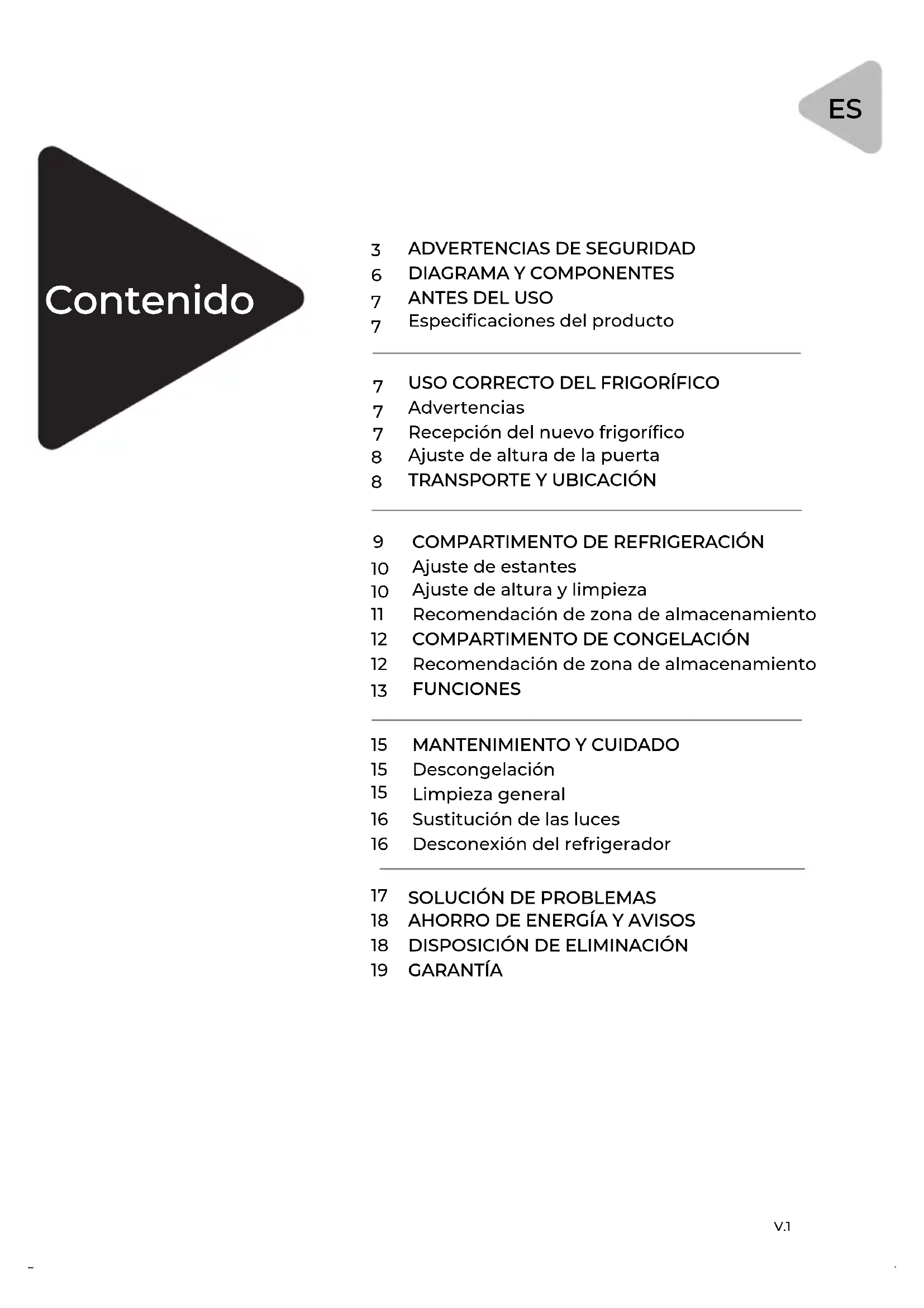 Advertencia: riesgo de fuego/materiales inflamables Este aparato está diseñado para ser utilizado en entornos domésticos y similares, como áreas de cocina del personal en tiendas, oficinas y otros entornos de trabajo; Casas rurales y por clientes en hoteles, moteles y otros entornos de tipo residencial; ambientes tipo bed&breakfast; Catering y aplica- ciones similares no minoristas. Si el cable de alimentación está dañado, debe sustituirlo el fabricante, su servicio técnico u otros profesionales de similar cualificación para evitar riesgos. No almacene sustancias explosivas como latas de aerosol con carburante inflamable en este aparato. El aparato debe desenchufarse después de su uso y antes de llevar a cabo el mantenimiento por parte del usuario. ADVERTENCIA: Evite cualquier obstrucción de las aberturas de ventilación del interior de la carcasa del aparato o en la estructura incorporada. ADVERTENCIA: No utilice dispositivos mecánicos u otros me- dios para acelerar el proceso de descongelación que no sean los recomendados por el fabricante. ADVERTENCIA: No dañe el circuito de refrigerante. ADVERTENCIA: No utilice aparatos eléctricos dentro de los compartimentos de almacenamiento de alimentos del apara- to, a menos que sean del tipo recomendado por el fabricante. ADVERTENCIA: deseche el frigorífico de acuerdo con la normativa local, ya que emplea gas inflamable y refrigerante. ADVERTENCIA: Al colocar el aparato, asegúrese de que el cable de alimentación no quede atrapado o dañado. V.14 ADVERTENCIA: No coloque tomas de corriente o fuentes de alimentación portátiles en la parte posterior del dispositivo. No utilice cables de extensión, alargaderas ni adaptadores de dos pines sin conexión a tierra para conectar el aparato. PELIG RO: Existe riesgo de que los niños queden atrapados en el interior. Antes de tirar su viejo frigorífico o congelador: -Quítele las puertas. - Deje los estantes en su lugar para que los niños no puedan meterse fácilmente en el interior. El frigorífico debe desconectarse de la corriente eléctrica antes de realizar la instalación de cualquier accesorio. El refrigerante y el material de espuma de ciclopentano utilizados para el frigorífico son inflamables. Por lo tanto, cuando se deseche el frigorífico, debe mantenerse alejado de cualquier fuente de fuego y ser recuperado por una empresa especializada con la calificación correspondiente, y nunca debe eliminarse por combustión, para evitar daños al medio ambiente o cualquier otro riesgo. Estándar EN: este dispositivo puede ser usado por niños de 8 años en adelante y personas con capacidades físicas, senso- riales o mentales reducidas o con falta de experiencia y conocimiento, siempre que se les proporcione supervisión o instrucciones sobre el uso del dispositivo de manera segura y que entiendan los peligros que su uso implica. Los niños no deben jugar con el aparato. La limpieza y el mantenimiento del usuario no deben ser realizados por niños sin supervisión. Los niños de 3 a 8 años de edad pueden cargar y descargar aparatos de refrigeración. Para el estándar IEC: este dispositivo no está diseñado para ser utilizado por personas (incluidos niños) con capacidades físicas, sensoriales o mentales reducidas, o con falta de expe- riencia y conocimiento, a menos que hayan sido supervisados o instruidos sobre el uso del dispositivo por parte de una persona responsable por su seguridad. Los niños deben ser supervisados para asegurarse de que no jueguen con el aparato. V.15 Para evitar la contaminación o desperdicio de los alimentos, tenga en cuenta las siguientes instrucciones: Abrir la puerta durante períodos prolongados puede provocar un aumento significativo de la temperatura en los compartimentos del aparato. Limpie regularmente las superficies que puedan entrar en contacto con alimentos y sistemas de drenaje accesibles. Limpie los tanques de agua si no se han utilizado durante 48 h; y enjuague los sistemas conectados al suministro de agua si no se ha extraído agua durante 5 días. (nota 1) Guarde la carne y el pescado crudos en recipientes ade- cuados en el frigorífico, de modo que no entren en contacto ni goteen sobre otros alimentos. Los compartimentos de alimentos congelados de dos estrellas son adecuados para almacenar alimentos pre-congelados, almacenar o hacer helados y hacer cubitos de hielo. (nota 2) Los compartimentos de dos y tres estrellas no son adecuados para la congelación de alimentos frescos.(nota 3) Los aparatos sin compartimento de 4 estrellas no son aptos para la congelación de alimentos. Si el aparato de refrigeración se va a dejar vacío durante un período prolongado, apáguelo, descongélelo, límpielo, séquelo y deje la puerta abierta para evitar que se forme moho dentro del aparato. Notas 1, 2, 3, 4: confirme si son aplicables según el tipo de compartimento de su producto. Los aparatos de libre instalación no deben usarse como integrables. Cualquier sustitución o reparación de las bombillas LED debe ser lleva da a cabo por el fabricante, su servicio técnico o un profesiona l debidamente cualificado. Este producto contiene dos fuentes de luz de clase energética G. V.1IMPORTANTE: Lea atentamente estas instrucciones y guarde el manual para futura referencia. AVISO Antes de usar el aparato, tenga en cuenta las instrucciones de seguridad. Lea este manual antes de utilizar el frigorífico y manténgalo a mano para futuras consultas. Los productos de EAS Electric están en constante mejora, por lo que están sujetos a cambios sin previo aviso. Si va a desechar un equipo de refrigeración, póngase en contacto con la autoridad local correspondiente para recibir instrucciones para desecharlo de forma segura. No almacene hielo seco dentro del frigorífico. Las imágenes de este manual tienen fines ilustrativos, por lo que algunas características y accesorios podrían no coincidir con el producto real. Tome el producto real como referencia. 1