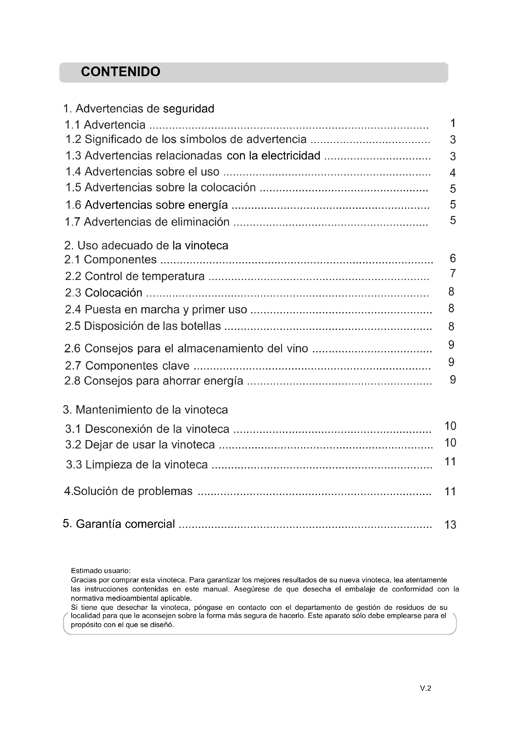 Estimado usuario: Gracias por comprar esta vinoteca. Para garantizar los mejores resultados de su nueva vinoteca, lea atentamente las instrucciones contenidas en este manual. Asegúrese de que desecha el embalaje de conformidad con la normativa medioambiental aplicable. Si tiene que desechar la vinoteca, póngase en contacto con el departamento de gestión de residuos de su localidad para que le aconsejen sobre la forma más segura de hacerlo. Este aparato sólo debe emplearse para el propósito con el que se diseñó.