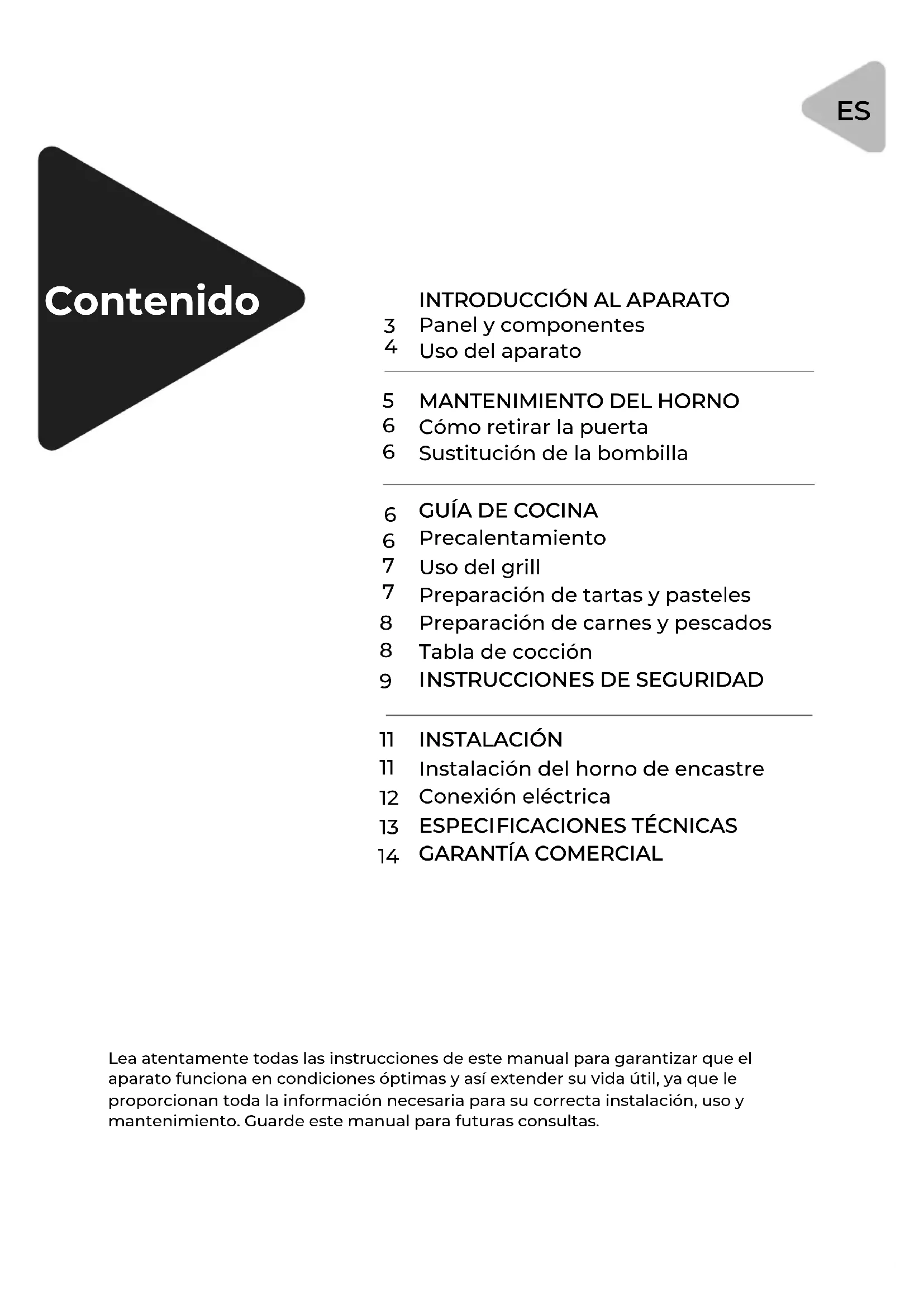 V.2Nota: Los tiempos de cocción son aproximados y puede variarlos según su gusto personal. Si se usa el modo grill o grill con ventilador, siempre debe colocar la bandeja en la 1ª altura de inserción desde abajo. Instrucciones de seguridad Para mantener la eficiencia y seguridad de este aparato, siga las siguientes instrucciones: Llame al Servicio Técnico Oficial si detecta algún error. Use siempre repuestos originales. En caso de que se dañe el cable de alimentación, debe sustituirlo el fabricante o un técnico autorizado con el repuesto original. El horno tiene unas agarraderas en los laterales para facilitar su transporte y evitar daños a las personas que lo muevan o al propio horno. Este horno está diseñado para uso doméstico no profesional, y no debe usarse para otros fines. El sistema eléctrico de este aparato sólo puede funcionar con seguridad si se conecta a un sistema con la debida conexión a tierra, de conformidad con la normativa eléctrica vigente. Cuando el aparato esté en marcha, las resistencias y algunas partes del horno se calientan mucho. Asegúrese de no tocarlas y manténgalas fuera del alcance de los niños. Durante el uso del horno se genera mucho calor. Tenga precaución de no tocar las resistencias. Los siguientes componentes suponen un riesgo potencial para los niños y personas con capacidades mentales, físicas o sensoriales reducidas, por lo que debe tomar las medidas adecuadas para evitar que puedan tocarlos: Los mandos; Embalaje (bolsas, corchos de poliestireno, clavos, etc.); El aparato cuando acaba de terminar la cocción o el grill, debido al calor que se genera; El aparato, cuando ya no está en uso. Evite las siguientes situaciones: Tocar el aparato con las manos húmedas; Usar el aparato descalzo; Tirar del cable de alimentación para sacarlo de la toma;