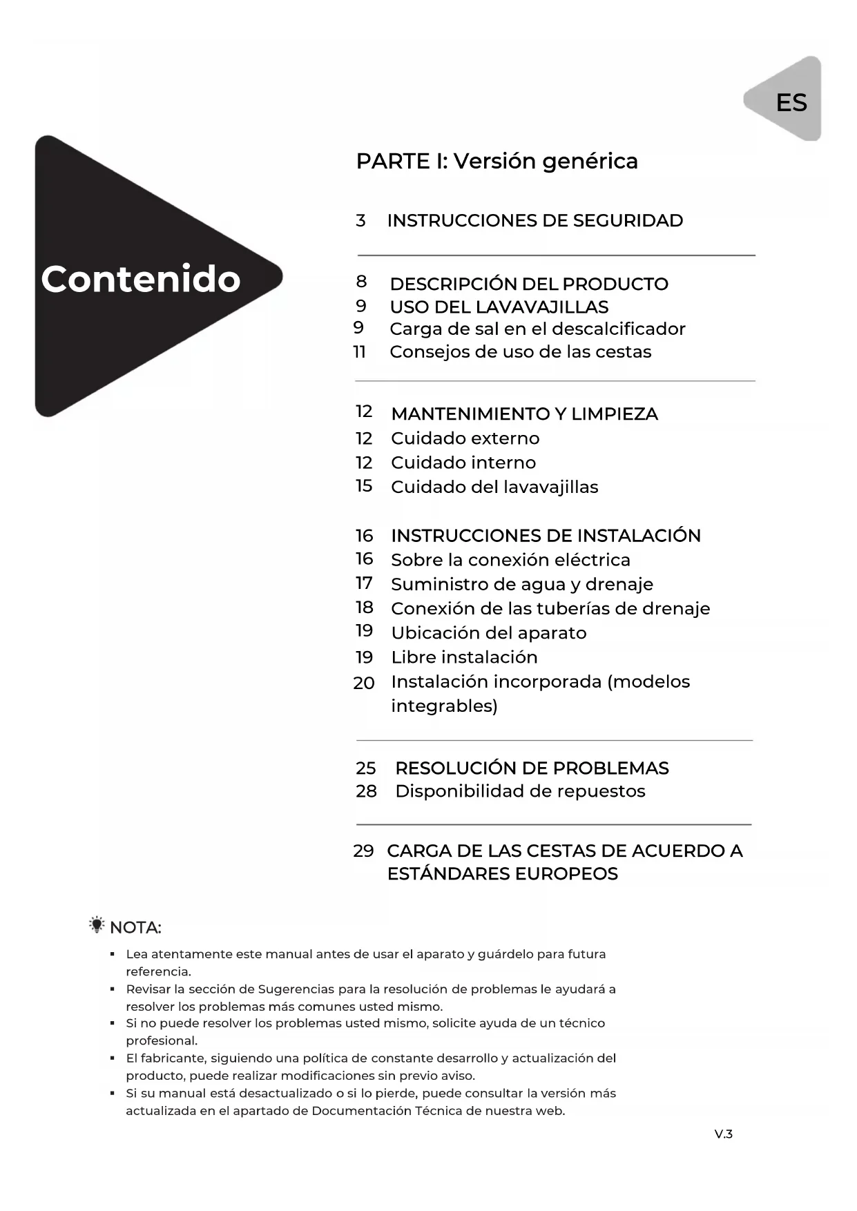 Carga de sal en el descalcificador Consejos de uso de las cestas NOTA: Lea atentamente este manual antes de usar el aparato y guárdelo para futurareferencia. Revisar la sección de Sugerencias para la resolución de problemas le ayudará a resolver los problemas más comunes usted mismo. Si no puede resolver los problemas usted mismo, solicite ayuda de un técnicoprofesional. El fabricante, siguiendo una política de constante desarrollo y actualización del producto, puede realizar modificaciones sin previo aviso. Si su manual está desactualizado o si lo pierde, puede consultar la versión más actualizada en el apartado de Documentación Técnica de nuestra web. PARTE I: Versión genérica