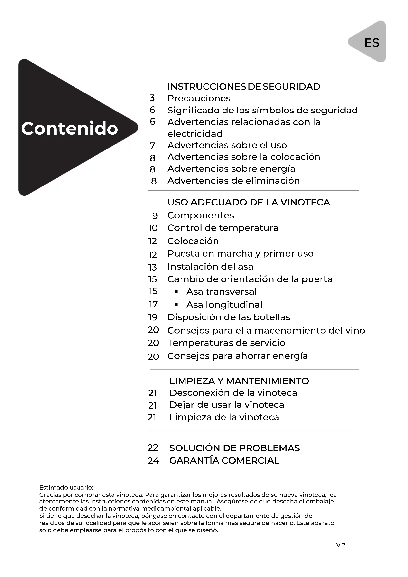 Estimado usuario: Gracias por comprar esta vinoteca. Para garantizar los mejores resultados de su nueva vinoteca, lea atentamente las instrucciones contenidas en este manual. Asegúrese de que desecha el embalaje de conformidad con la normativa medioambiental aplicable. Si tiene que desechar la vinoteca, póngase en contacto con el departamento de gestión de residuos de su localidad para que le aconsejen sobre la forma más segura de hacerlo. Este aparato sólo debe emplearse para el propósito con el que se diseñó. V.2