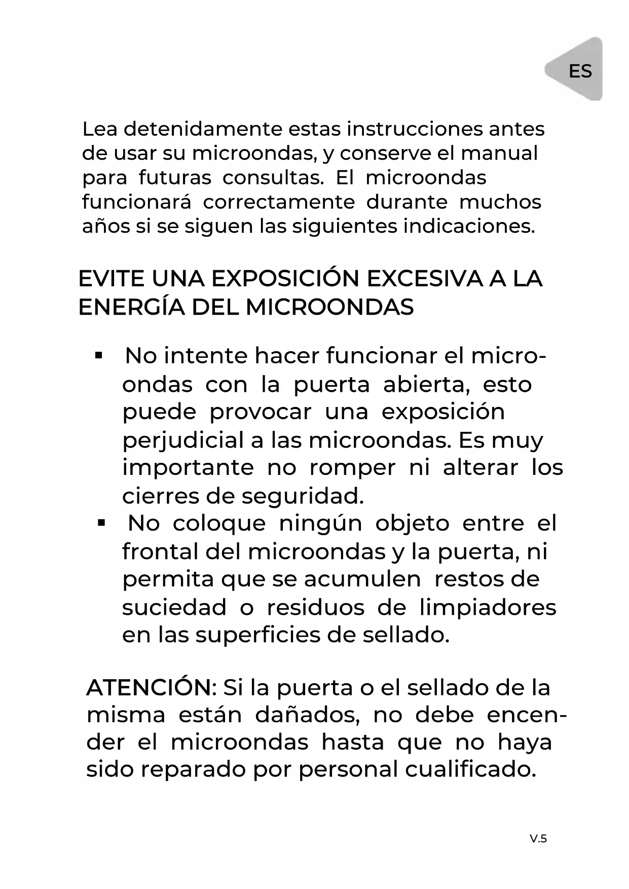 Escanee para ver este manual en otros idiomas y actualizacionesScan for manual in other languages and further updates Manuel dans d'autres langues et mis à jourManual em outras línguas e actualizaçõesV.5 No intente hacer funcionar el micro- ondas con la puerta abierta, esto puede provocar una exposición perjudicial a las microondas. Es muy importante no romper ni alterar los cierres de seguridad. No coloque ningún objeto entre el frontal del microondas y la puerta, ni permita que se acumulen restos de suciedad o residuos de limpiadores en las superficies de sellado. ATENCIÓN: Si la puerta o el sellado de la misma están dañados, no debe encen- der el microondas hasta que no haya sido reparado por personal cualificado. Lea detenidamente estas instrucciones antes de usar su microondas, y conserve el manual para futuras consultas. El microondas funcionará correctamente durante muchos años si se siguen las siguientes indicaciones. EVITE UNA EXPOSICIÓN EXCESIVA A LA