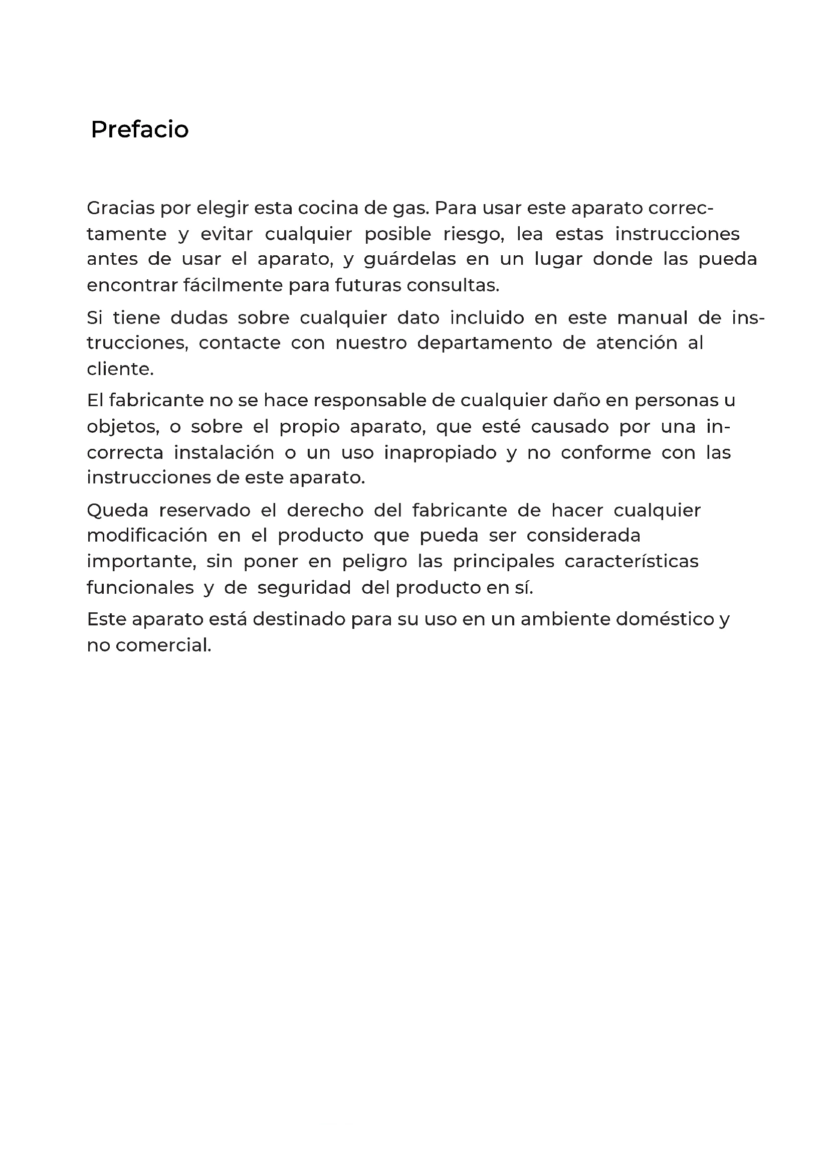 Escanee para ver este manual en otros idiomas y actualizacionesScan for manual in other languages and further updates Manuel dans d'autres langues et mis à jourManual em outras línguas e actualizaçõesGGMCI-315 Prefacio Gracias por elegir esta cocina de gas. Para usar este aparato correc- tamente y evitar cualquier posible riesgo, lea estas instrucciones antes de usar el aparato, y guárdelas en un lugar donde las pueda encontrar fácilmente para futuras consultas. Si tiene dudas sobre cualquier dato incluido en este manual de ins- trucciones, contacte con nuestro departamento de atención al cliente. El fabricante no se hace responsable de cualquier daño en personas u objetos, o sobre el propio aparato, que esté causado por una in- correcta instalación o un uso inapropiado y no conforme con las instrucciones de este aparato. Queda reservado el derecho del fabricante de hacer cualquier modificación en el producto que pueda ser considerada importante, sin poner en peligro las principales características funcionales y de seguridad del producto en sí. Este aparato está destinado para su uso en un ambiente doméstico y no comercial. V.6Contenido