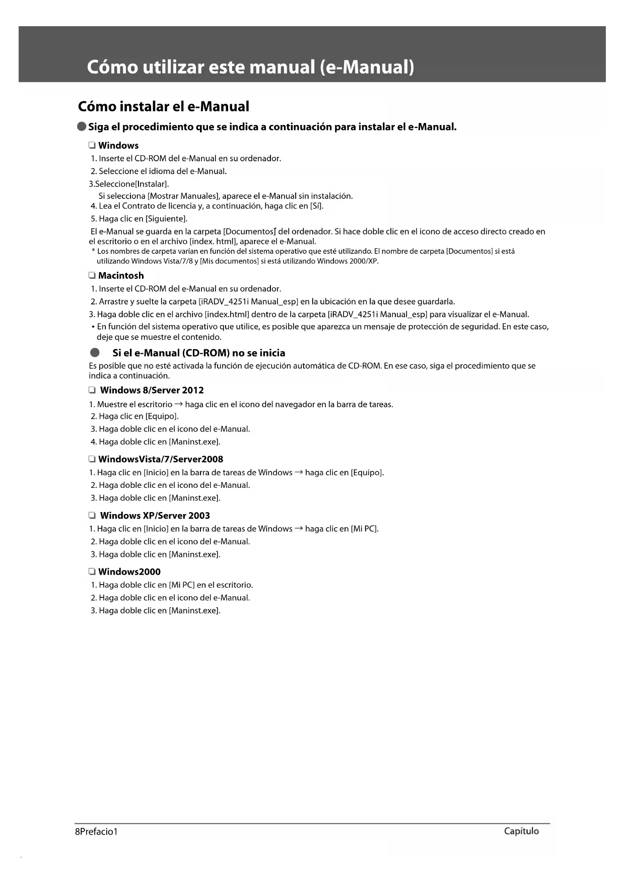 2. Haga doble clic en el icono del e-Manual. 3. Haga doble clic en [Maninst.exe]. ❏ Windows 2000 1. Haga doble clic en [Mi PC] en el escritorio. 2. Haga doble clic en el icono del e-Manual. 3. Haga doble clic en [Maninst.exe].Español 9 Prefacio 1 Página de inicio del e-Manual