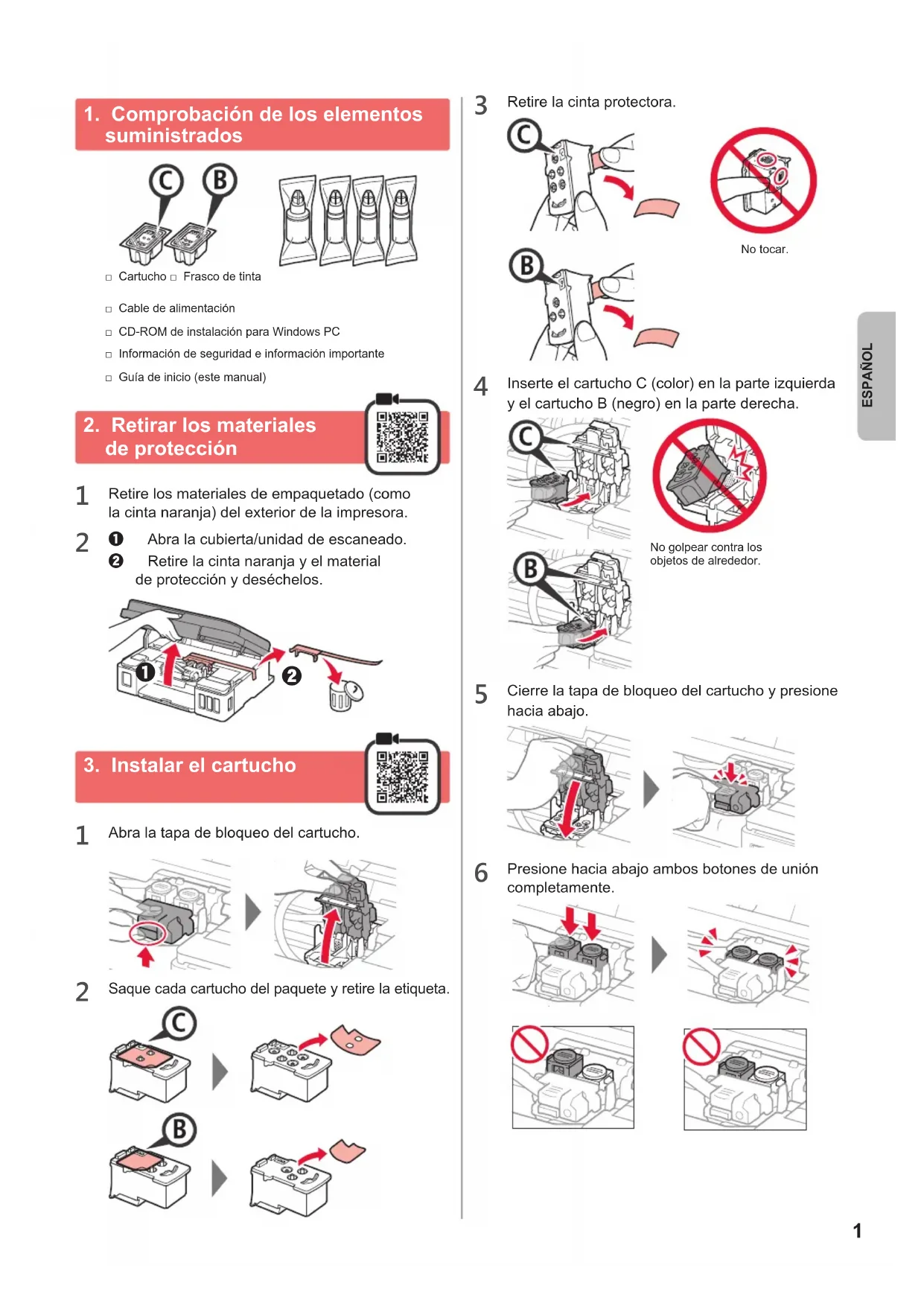 suministrados □ Información de seguridad e información importante □ Cable de alimentación □ CD-ROM de instalación para Windows PC □ Guía de inicio )este manual( □ Cartucho □ Frasco de tinta