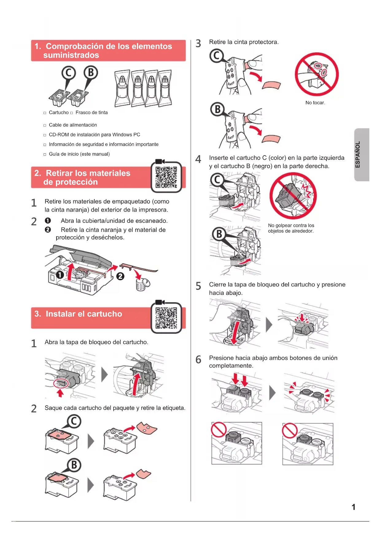 suministrados □ Información de seguridad e información importante □ Cable de alimentación □ CD-ROM de instalación para Windows PC □ Guía de inicio )este manual( □ Cartucho □ Frasco de tinta